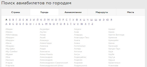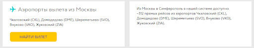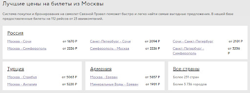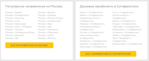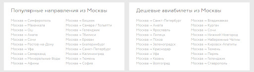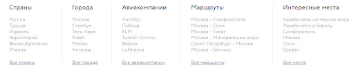 Мы в MediaNation проанализировали положение сайта по направлению «Авиабилеты» — собрали семантическое ядро из почти 4 000 запросов и разделили их по типам страниц. Например, запрос «авиабилеты москва сочи» приходится на страницу маршрута, запрос «авиабилеты из москвы» приходится на страницу города и т.д.