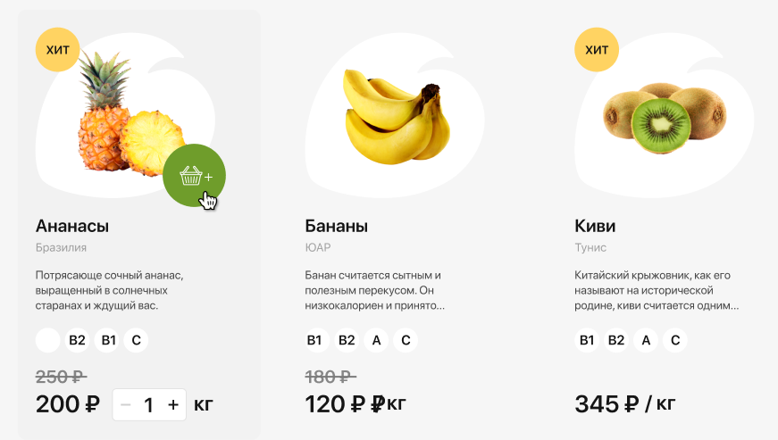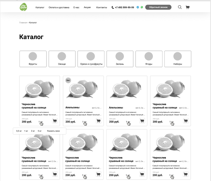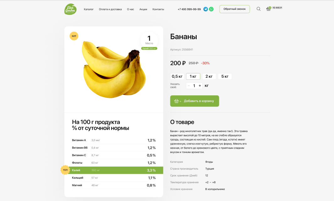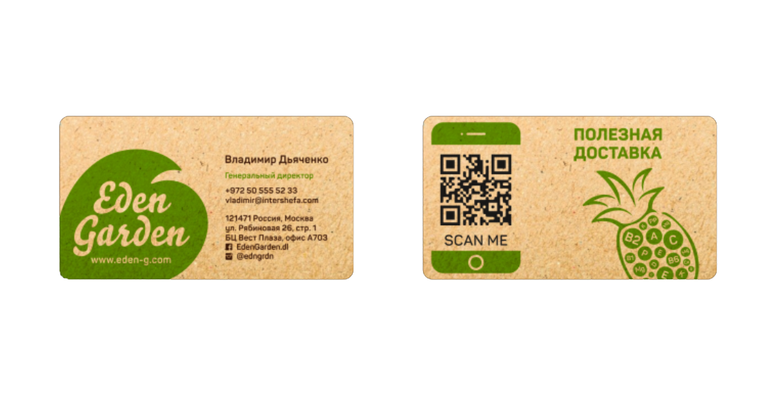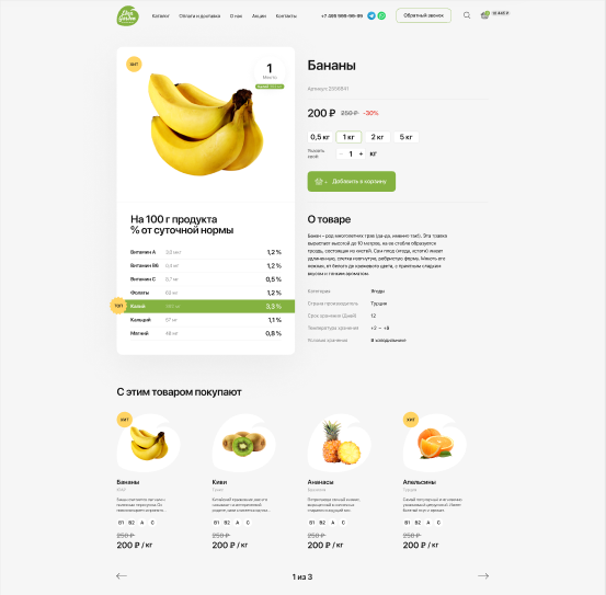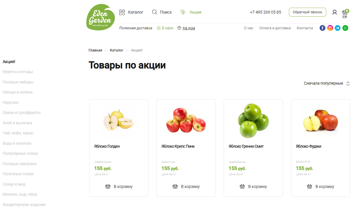 Помимо сайта компании было необходимо продумать стиль и других элементов-носителей, с которыми клиент Eden Garden столкнется в offline. Было важно не только что клиент получит, но и процесс получения самого заказа. Мы разработали дизайн упаковки продуктов и униформы для службы доставки, брендировали транспорт, чтобы каждая точка контакта с брендом передавала его основные ценности. Из сайта-визитки с одной лишь контактной информацией мы сделали полноценный интернет-магазин: наполнили сайт актуальным ассортиментом товаров, добавили корзину и возможность заказа онлайн. Также мы перевели сайт на платформу MODx с открытым кодом, которая позволила расширить функционал и добавить фильтры по категориям товаров, корзину и функцию заказа обратного звонка. Таким образом, часть бизнес-процессов Eden Garden была переведена на сайт, что значительно автоматизировало работу компании в целом. Конкуренция на рынке доставки продуктов оказалась довольно высокой, поэтому перед нами встала задача сформировать уникальность предложения Eden Garden. После подробного аудита рынка мы нашли несколько инсайтов: Эти наблюдения вдохновили нас на расширение функционала сайта: Вместе с разделом «Подарочные наборы» мы добавили раздел «Акции», так как в силу специфики товара компании иногда выгодно отпускать продукты по акционной цене, чтобы продукты не испортились на полках. Мы решили и дальше развивать «витаминную» тему и добавили к описанию товара процентное соотношение полезных веществ от суточной нормы потребления. Также мы упростили процесс добавления товаров в корзину. Переход в карточку товара стал необязательным, товар можно отправить в корзину, кликнув на значок корзины. Так мы ускорили наполнение корзины продуктами. Для удобства заказа с разных девайсов мы создали три версии сайта: десктопную, мобильную и для планшета. После создания сайта мы занялись его контентным наполнением: создали карточки товаров с подробными описаниями продуктов, оформили все фильтры и рейтинги. С момента создания сайта прошло уже несколько лет. Компания выросла и расширила возможности доставки: теперь продукты можно заказать не только в офис, но и домой. Пандемия Covid-19 сместила фокус компании с фруктов и овощей, компания значительно расширила ассортимент, добавив целый ряд новых категорий товаров.