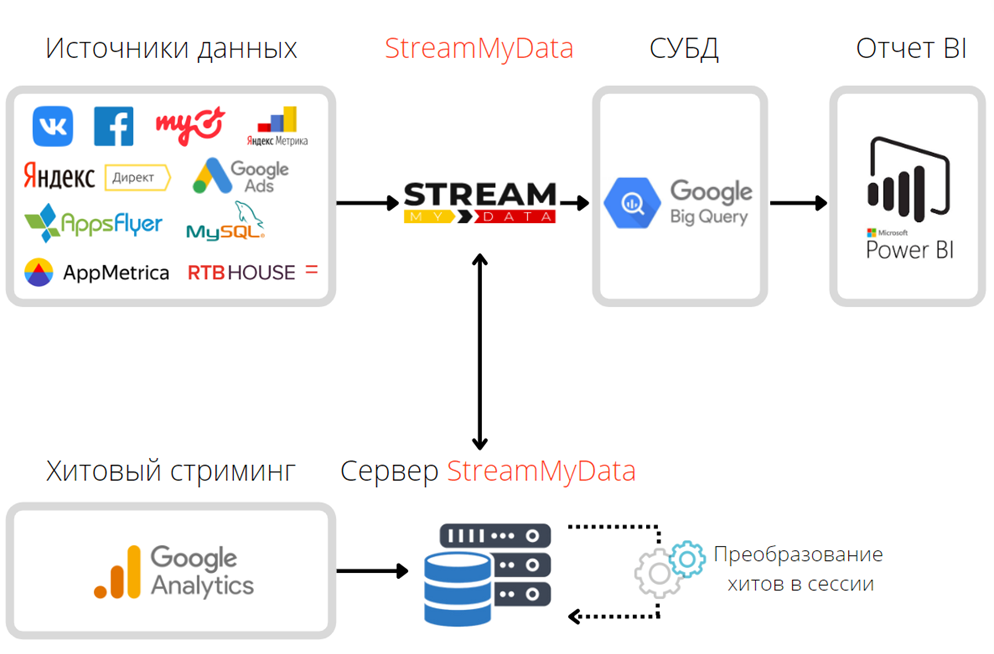 - Сбор данных — выгрузка данных из систем аналитики, рекламных систем, внутренних CRM-систем и любых других источников, которые находятся в доступе клиента и хранят полезные данные (рис. 2). Осуществляется при помощи собственных коннекторов StreamMyData от агентства MediaNation. Данный этап подробно расписан в кейсе по сквозной аналитике для сервиса ЛитРес.