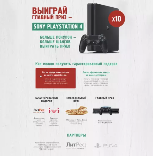 Распространенный способ BTL-активности — стимулирующие акции. Например, в случае с Papa John’s, потребитель покупает пиццу, сканирует код с упаковки, оставляет свои контактные данные в форме на лендинге и становится участником розыгрыша призов. Способ привычный, давно известный и работает до сих пор. Пользователь ждет приз и думает о бренде больше обычного, иногда даже привлекает к участию своих друзей, родственников и знакомых, а бренд взамен получает контакты своих потребителей и потенциальной аудитории.