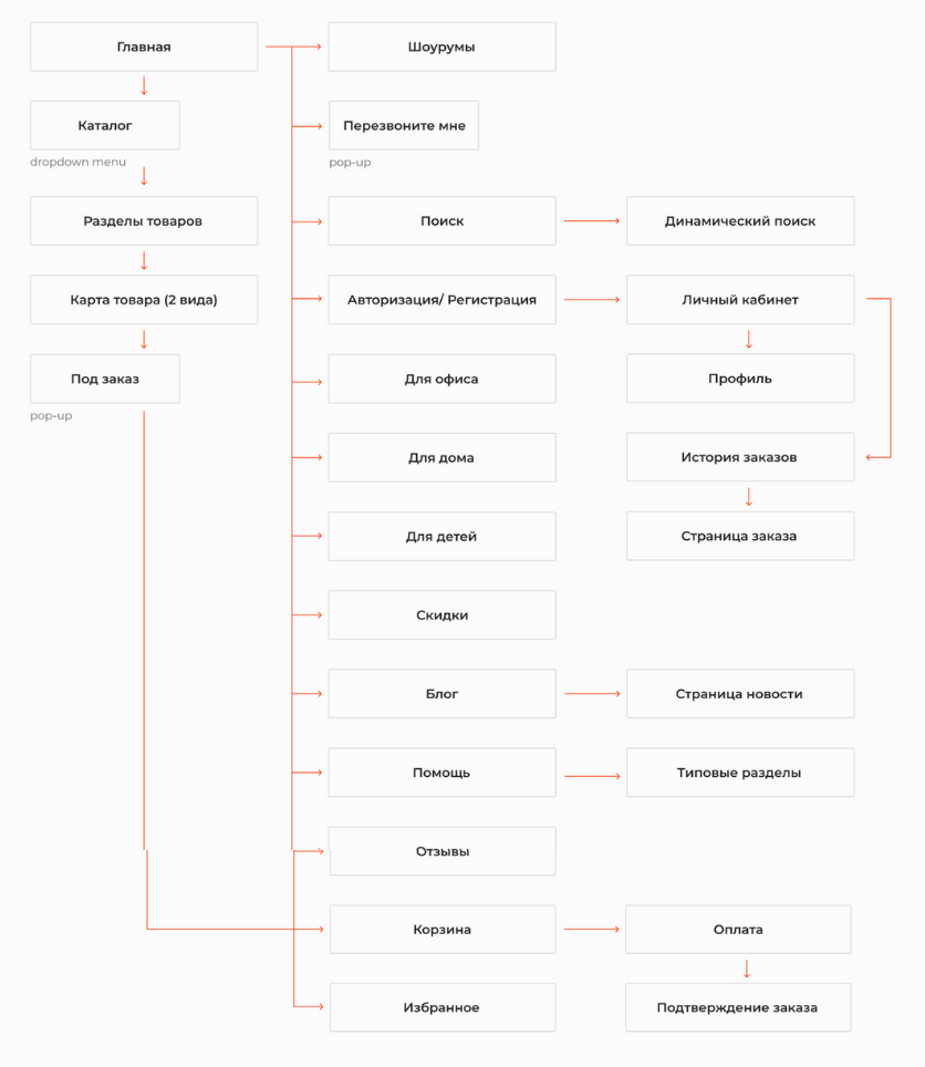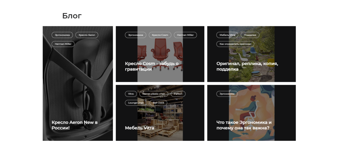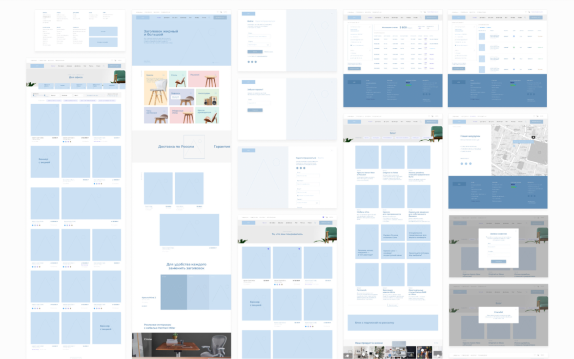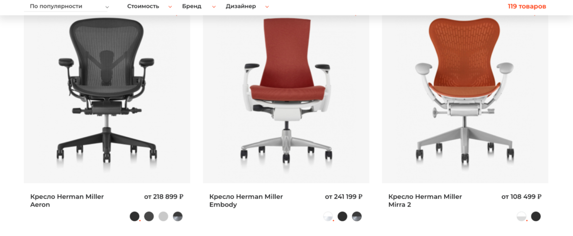 Нам было важно, чтобы версия для смартфонов и планшетов не теряла в функциональности и не казалась «урезанной». Для этого мы соблюдали принцип Mobile First — когда мобильная версия сайта разрабатывается перед десктопной. Перед разработкой сайта мы погрузились в бизнес клиента, изучили целевую аудиторию, ее потребности и предпочтения. На основе данных, полученных от клиента, мы разделили потенциальных посетителей на 4 основные группы: Такое деление позже мы закрепили прямо в шапке сайта вместе с каталогом. Нам было важно не позволить посетителю «заблудиться» на сайте. Использование сайта должно быть максимально простым — от первого экрана до корзины. Поэтому мы разработали логичную структуру сайта, в том числе ориентируясь на результаты анализа ЦА: Затем создали множество дизайн-прототипов сайта и совместно с клиентом, исходя из потребностей аудитории, выбрали лучший — тот, который отразит широкий ассортимент товаров и не запутает пользователя. Когда базовые работы были выполнены, мы приступили к оформлению страниц. Начали с деталей — выбрали оттенки и шрифт сайта. Напомним, нам было необходимо сохранить стилистику бренда Herman Miller. Далее мы стали наполнять страницы контентом. Команда дизайнеров следила за тем, чтобы минимализм и детальная точность соблюдались на всех этапах создания сайта. Задача первого экрана — с первого взгляда влюбить пользователя в продукт компании или, как минимум, заинтересовать пользователя и привлечь его к просмотру сайта. Первый экран сделали в формате карусели с культовыми товарами, чтобы заинтересовать пользователя. На втором экране разместили блоки с категориями товаров каталога, чтобы сразу сориентировать пользователя, если он пришел за определенным товаром. На третьем экране разместили карусель с УТП магазина. Все остальные экраны — это обзор популярных товаров и интерьеров. Вот как выглядит каталог: Мы использовали минимум текста в оформлении, чтобы сделать акцент на визуальной части. Более 80% сайта занимают фотографии товара. Это тот минимализм, которого мы хотели достичь, — ничто не должно отвлекать пользователя от просмотра товаров. Если пользователь захочет изучить подробные характеристики — кликнет по картинке и перейдет в карточку, где сможет изучить подробности. При открытии карточки мебель и предметы интерьера отображаются не в отдельном фото, а на самой странице. Так мы будто помещаем пользователя в пространство, где находится демонстрируемый объект. И только после прокрутки вниз товар «перетекает» в отдельное изображение. Сделали горизонтальный фильтр с параметрами для подборки товаров. Фильтр удобно крепится к шапке страницы при скролле. Товары интернет-магазина Contract Interiors Shop находятся в ценовом сегменте «выше среднего», а акцент сделан на комфорте пользования и качестве товара, поэтому в галерее каждого товара разместили детальные фото, чтобы пользователь мог лишний раз рассмотреть продукт поближе. Далее на главной странице — демонстрация интерьеров. Очень эффективный блок, которым пренебрегают многие мебельные сайты: перед пользователем появляется не просто товар на белом фоне, а целая презентация, где потенциальный покупатель видит, как мебель выглядит в интерьере. Это помогает человеку визуализировать собственное пространство, представить в нем товар и бы