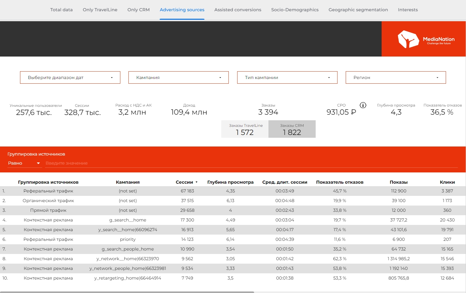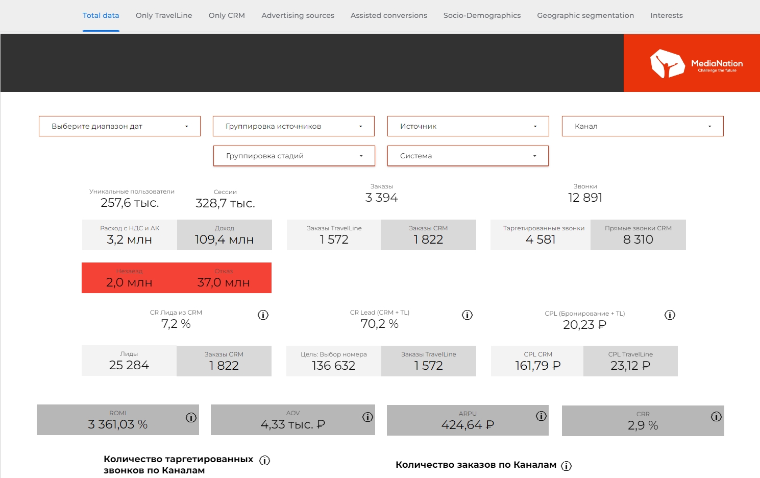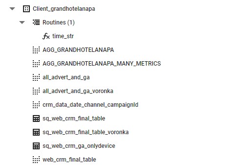 Мы пообщались с клиентом и выявили его боли: Чтобы решить эти проблемы мы разработали и настроили систему сквозной аналитики и визуализировали автообновляемый отчет в Google Data Studio: Мы не можем называть реальные показатели бизнеса клиента, поэтому заменили их на искусственные данные, сохранив структуру отчета. Клиент активно развивал маркетинг и использовал практически все доступные каналы для продвижения: контекстную рекламу, таргетированную рекламу, SEO, e-mail маркетинг, ремаркетинг, партнерские программы, работа с OTA (online travel agencies), сотрудничал с онлайн-сервисами для бронирования отеля и т.д. В ноябре мы запустили для клиента масштабную рекламную кампанию в Яндексе, Google Ads, Facebook и Instagram с целью привлечения гостей в несезонный период. В результате загрузка отеля увеличилась на 19%, и клиент стал получать на 70% больше продаж. Подробнее читайте в кейсе «Увеличили загрузку отеля на 19% и привлекли на 70% больше продаж в межсезонье». Чтобы собрать такой большой объем данных из всех этих каналов в единый отчет, необходимо было настроить коннекторы для передачи потоков данных из различных систем: Битрикс24, Calltouch, Google Analytics, рекламные кабинеты. 1. CRM (Битрикс24): собирает информацию о заказах, доходах, источниках и каналах, лидах, стадиях сделок по нескольким воронкам, и т.д. Для сбора данных из Битрикса24 нам понадобилась помощь клиента. Во время брифинга Степан продемонстрировал, как устроен Битрикс24 отеля, и обратил внимание на наличие нескольких воронок продаж. Степан также предоставил техническое задание с нужными показателями, которые было необходимо вывести в отчет — процент сделок Travelline, количество таргетированных и обычных звонков, количество заказов Travelline и Calltouch, стоимость лида привлеченного из рекламы (TravelLine) и др. В процессе разработки коннектора для передачи данных мы столкнулись с программными сбоями и ограничениями API: Решить эти проблемы помогла разработка кастомного программного продукта по отправке данных пакетами. 2. Calltouch: система телефонии, содержит информацию о звонках с потенциальными клиентами отеля и рекламные идентификаторы. На старте проекта данные Calltouch уже были интегрированы в CRM, поэтому мы настроили их выгрузку в рамках коннектора с Битрикс24. 3. Google Analytics: содержит аналитические данные, такие как количество сессий, среднюю длительность сессий, глубину просмотра, показатель отказов, пол и возраст аудитории, достигнутые цели, ассоциированные конверсии, многоканальные последовательности и др. 4. Рекламные кабинеты Google Ads, Яндекс.Директ, Facebook, Instagram, Вконтакте, MyTarget. Хранили показатели для оценки эффективности рекламы, передачу которых мы настроили в виде потоков. Мы выгрузили данные по показам, кликам, расходам рекламных источников с разбивкой по кампаниям. С помощью агентского продукта StreamMyData (SaaS-решение для сквозной аналитики) мы настроили ежедневную автообновляемую выгрузку данных из системы аналитики и рекламных кабинетов по API в базу данных. В качестве хранилища для этого проекта выбрали Google BigQuery. Мы в MediaNation нашли способ оплаты сервисов Google даже после их ухода с российского рынка, поэтому, по-прежнему используем Google BigQuery. Но не исключаем возможность окончательного отключения сервиса и стали также использовать отечественное хранилище данных — ClickHouse от Yandex Cloud. Нам было необходимо понять, как и в какой последов