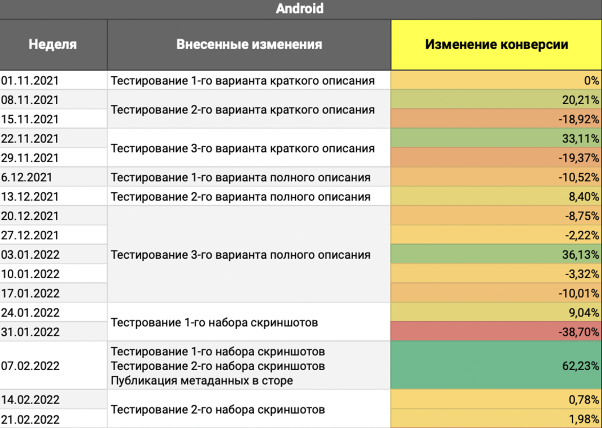 Кант активно развивал приложение. Чтобы поддерживать постоянный контакт с клиентами, компания регулярно отправляла push-уведомления со скидками на определенные категории товаров или напоминания о товарах, которые лежали в корзине. Это увеличивало процент удержания и коэффициент вовлеченности. Однако в течение года с момента публикации приложения клиент не проводил оптимизацию страниц: Это ограничивало ранжирование по ключевым словам, видимость приложения и объемы органического трафика. С течением времени товары в приложении обновлялись, менялись тренды и сезонность. Приложению была необходима регулярная оптимизация страниц, чтобы привлекать больше потенциальных покупателей. В октябре 2021 года клиент обратился в MediaNation с задачей повысить видимость приложения Кант в Google Play и App Store для увеличения конверсии в установку и роста продаж с этого канала. Нашими KPI в достижении этой цели было всегда занимать топ-5 позиций по ключевым запросам в магазинах приложений. Мы провели подробный ASO-аудит: проанализировали страницы приложений клиента и конкурентов, позиции приложений по ключевым запросам, анализ текстовых и графических элементов. По результатам аудита определили список работ для улучшения результатов на предстоящий год: Ключевой особенностью продукта клиента является выраженная сезонность. В зависимости от времени года магазин активно предлагает разные товары. Было важно, чтобы в зимний период делался акцент на лыжи, а в летний — на велосипеды и туризм. Для каждого сезона мы готовили новые тексты и изображения, оптимизированные под поиск в сторах. Пример краткого описания на летний сезон: "Велосипеды, самокаты, спортивная одежда и обувь по выгодным ценам!". Пример заголовка на зимний сезон: "Кант — всё для зимнего спорта". К работе мы приступили в ноябре и начали с зимних видов спорта. Мы собрали семантическое ядро с набором ключевых слов, которые относятся к приложению Кант: На основе ядра подготовили метаданные, в которые вошли название приложения, краткое описание для Google Play, заголовок и подзаголовок для iOS, полное описание. Затем запустили тестирование трех вариантов каждого элемента с помощью нативного инструмента "Эксперименты со страницей приложения" в Google Play Console. Например, для определения лучшего краткого описания мы протестировали следующие вариации: Самым эффективным оказался первый вариант. Долгое время тестирование в App Store без использования дорогостоящих сторонних сервисов было недоступно. Но в начале 2022 года App Store Connect представил собственный бесплатный инструмент для тестирования элементов страницы приложения. Мы воспользовались им для тестирования новых скриншотов. Проводили тесты параллельно в App Store и Google Play. Вариант краткого описания, который оказался самым эффективным по итогам тестирования: Лучшие тексты и изображения по результатам тестирования были опубликованы на страницах приложений в магазинах. Так за все время работы мы провели девять тестов различных текстовых графических метаданных и несколько дополнительных тестов для тестирования гипотез при подготовке финальных вариантов. Одна из таких гипотез: красный цвет отпугивает пользователей. Она подтвердилась в результате теста: на страницу изображения с красными элементами кликали меньше всего. В результате мы остановились на оран