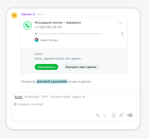 - перевод вызова на другого сотрудника с сохранением истории общения и сделок;