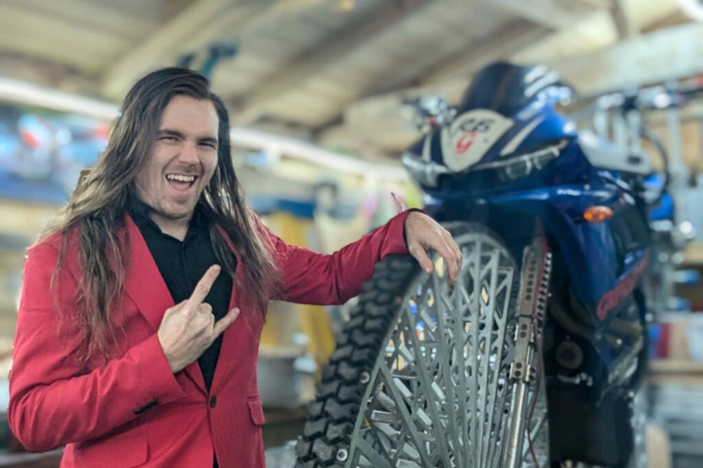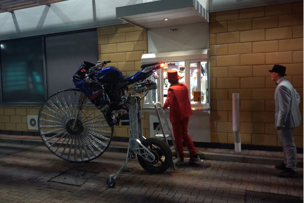 В качестве основы для своего творения инженер использовал старый мотоцикл Yamaha R6, при этом почти всю новую ходовую часть он изготовил своими руками. Итогом стал эффектный, но, как сообщает сам автор, совершенно непрактичный аппарат для езды. Ситуация немного улучшилась после удаления амортизирующих элементов из подвески, однако управляемость осталась на катастрофически низком уровне.