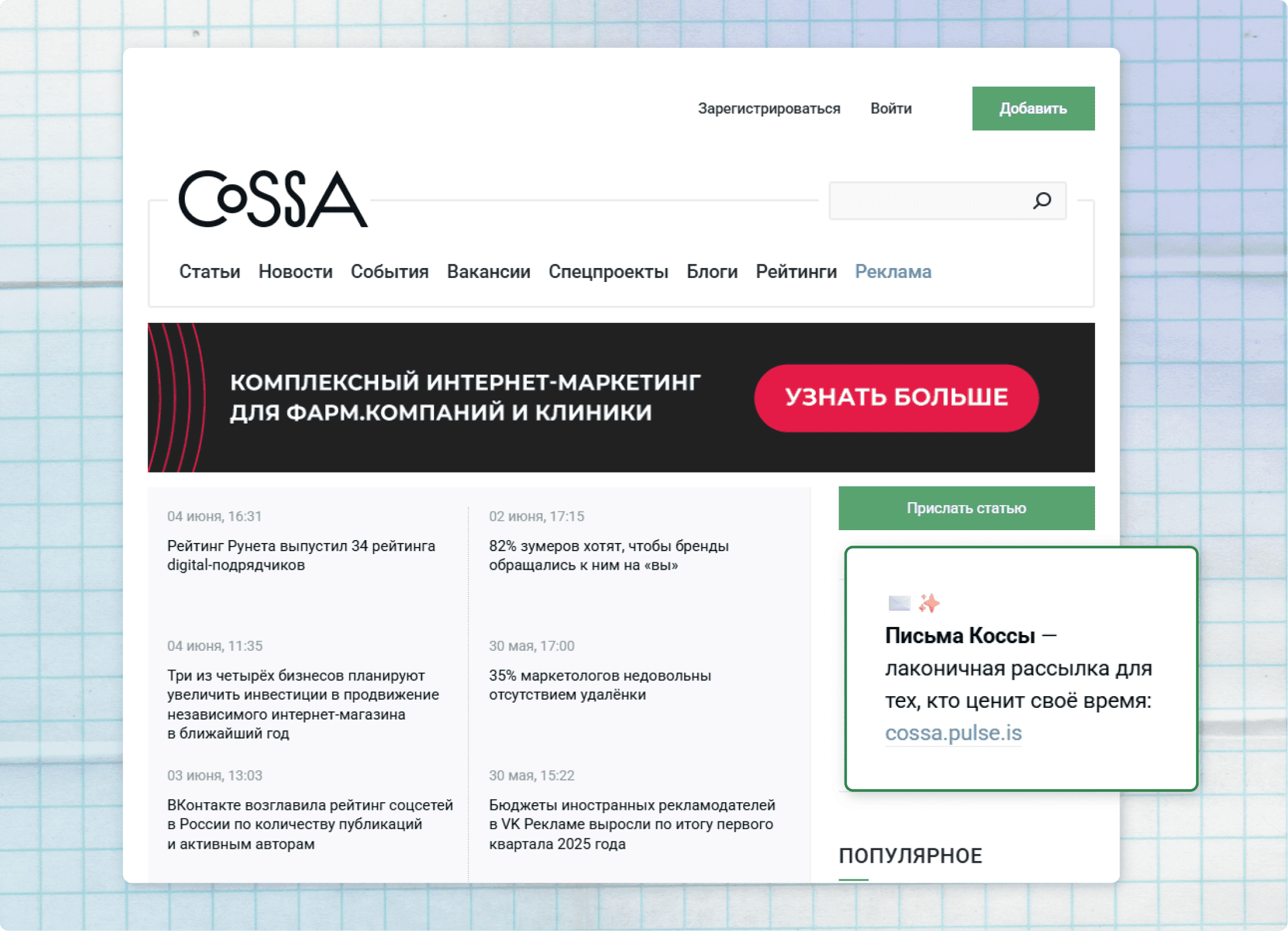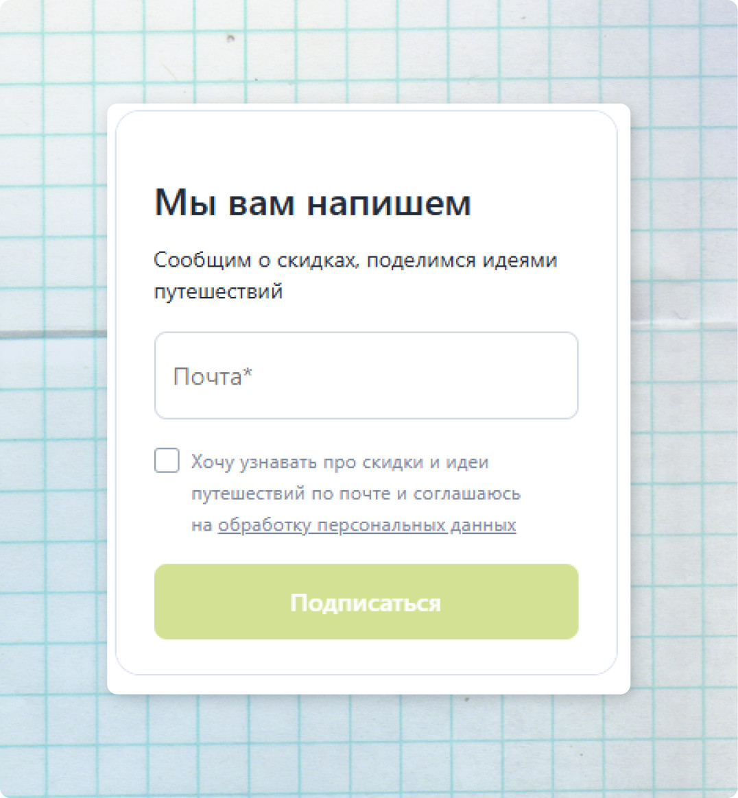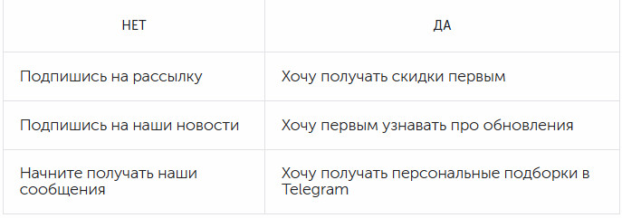 Изучите, как пользователи перемещаются по сайту и другим каналам, и разместите форму подписки там, где её точно заметят: на акционных страницах, в блоге, на этапе оформления заказа или в других точках с высоким вниманием. Используйте данные аналитики, чтобы найти лучший вариант. Настройте pop-up, который появляется через определённое время или при выходе с сайта, когда юзер уже принял решение, подходит ему информация или нет. Для подписок внутри приложений или в мессенджерах сделайте фокус на пользе: скорость получения информации, удобный формат, возможность не пропустить самые выгодные предложения или узнать об обновлениях первым. Много полей для заполнения, специфические данные и несколько шагов для авторизации с подтверждениями — такая форма подписки на рассылку скорее отпугнёт пользователя. Особенно если заполнять нужно каким-то определённым образом, на что уходит лишнее время. Например, если форма не принимает номер телефона без кода страны и его приходится вводить вручную. Сбор дополнительных данных, кроме основных, для простой подписки также не вызывают доверия у пользователей. К примеру, непонятно, зачем оставлять email-адрес, если нужна push-рассылка. Максимально упростите путь клиента и уменьшите время на подписку. Идеально, если процесс занимает несколько секунд. Запрашивайте один контакт — электронную почту или телефон. При необходимости можно дополнительно попросить имя. Для сбора базыpushдостаточно сделать форму в один клик, где не выставляются никакие дополнительные данные. Важно только своевременно и правильно оформить предложение: объяснить выгоду. Другой вариант — пригласить подписаться, когда клиент оставляет положительный отзыв. Это значит, что он лоялен и с большей вероятностью захочет продолжить коммуникацию с вашим брендом. Хорошо оформленная подписная страница напрямую влияет на рост базы и удержание аудитории. Она должна быть частью общей дизайн-системы, не выглядеть устаревшей и «серой». В современном потоке информации человека постоянно «атакуют» предложениями подписаться. При такой конкуренции за внимание они выбирают только то, что действительно интересно и ценно для них. Поэтому призывы вроде «подпишитесь на новости» или «оставайся с нами» никак не выделяют вас и не мотивируют оставить свой контакт. Человек просто не понимает, зачем ему ещё одна рассылка — и тогда база клиентов не растёт. Важно заранее продумать, какую выгоду получит клиент от подписки — и донести это за считанные секунды, ведь решение принимается быстро. Объясните, для кого предназначена рассылка, чем она полезна и какую проблему помогает решить. Покажите конкретную ценность: бонусы (скидки, чек-листы, баллы, бесплатные материалы), быстрый доступ к информации, персональные предложения и полезный контент. Примеры: Также чтобы собирать подписчиков эффективнее, важно учитывать интересы аудитории и делить её на группы пользователей. Это позволяет создавать более релевантный контент, настраивать персонализированные рассылки и предлагать персональные предложения прямо в форме подписки. На странице рассылки можно указать параметры рассылки, чтобы подписчик сам выбрал, что ему интересно. А с помощью таргетированной рекламы легко привлекать именно целевую аудиторию. Призыв к подписке должен быть заметным и уместным. Про