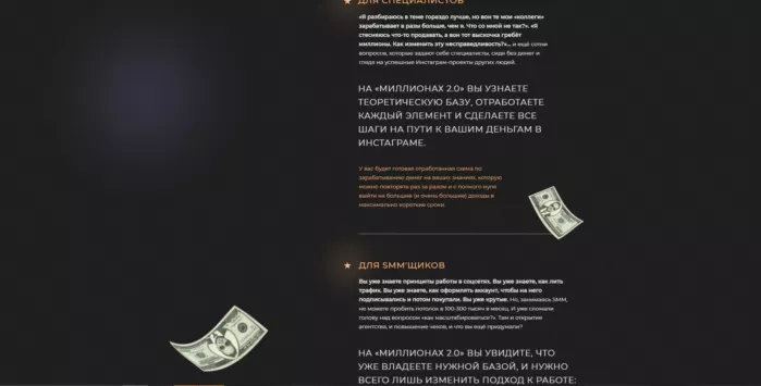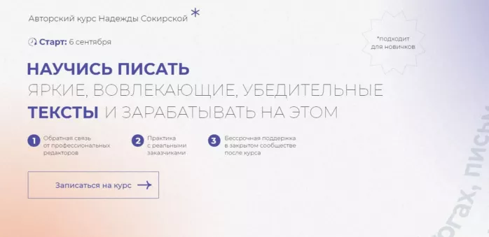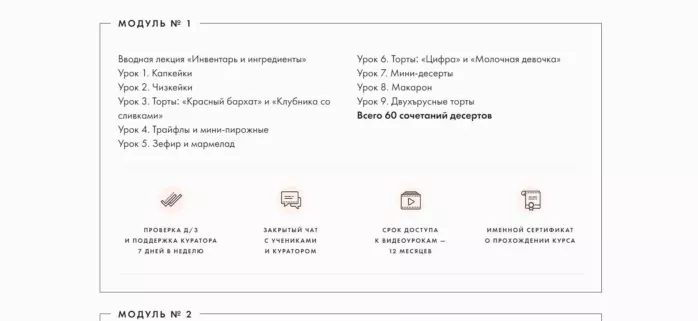 Как только человек перешел на страницу, буквально за 1-3 секунды он должен понять, что ему предлагают. Здесь нужно разместить заголовок, название вашего продукта и его краткое описание. Может представлять из себя как несколько строк текста, так и список преимуществ. Дату начала и кнопку записи оставляем здесь же. Например, курс по мануальным техникам нужен остеопатам, массажистам или врачам восточной медицины. Мастер-класс по выпечке пирожных будет полезен тем, кто делает выпечку на заказ, и любителям кондитерского дела, которые любят готовить для семьи или друзей. Вот, например, фрагмент лендинга курса для продюсеров. Если говорим об онлайн-курсе, платят люди не столько за знания, сколько за решение конкретной проблемы. Поэтому не забывайте описывать, с какими «болями» к вам можно обратиться и почему именно к вам. Выписываем потребности, а рядом характеристику вашего продукта, которая ее закрывает. Вы должны закрывать каждую потребность, что закрывают конкуренты. В идеале — делать это еще и лучше. Например, у вас онлайн-курс. Потребность: получить знания, но не тратить много времени на обучение. Ваш ответ: наши ролики с уроками длятся не больше 30 минут. Потребность: Чтобы было недорого. Ваш ответ: действует скидка 20% до __ числа. Здесь перечисляем, из каких модулей/блоков/этапов состоит ваш продукт. Это один из самых важных блоков, а ваша задача — подробно рассказать и показать, что ждет тех, кто приобрел продукт. Пример: Не забываем про отзывы. Человеку проще решиться на покупку, если товар до него уже кто-то покупал. Первопроходцем в этом деле быть никому не хочется. Поэтому собираем отзывы о продукте. Если их нет, собирайте первых пользователей и дайте им попробовать продукт за отзыв. Отзывы можно прикрепить скринами или же красиво оформить, но при этом оставить контакты человека. Так, чтобы люди понимали, что это реальный пользователь, а не ваши бурные фантазии. Можно оформить отзывы в видеоформате, чтобы ученики рассказали о том, как сложилась их жизнь после курса в небольшом ролике. Тарифы тоже расписываем четко и не балуем клиентов их обилием, иначе они потеряются. Двух-четырех будет достаточно. Когда говорим об эксперте, не нужно вспоминать все его заслуги вроде красного диплома экономиста и окончания школы с золотой медалью. Особенно, если перед нами кондитер. Конечно, пытаться вывозить за счет дизайна лендинга это ошибка. Но не обращать на него внимание тоже грубейшее нарушение. Потому что дизайном можно как усилить наполнение лендинга, так и пасть в глазах аудитории. Если в дизайне вы мало что понимаете, не пытайтесь креативить. Лучше сделать проще и не рисковать. Выберите 2-4 сочетающихся между собой цвета и не забудьте выделить кнопки с действиями купить, заказать и т.д. в начале и конце сайта. Еще одна грубая ошибка — использование неадаптивного дизайна, потому что основной трафик идет с мобильных устройств и если пользователям будет неудобно находиться на сайте со смартфона, они его покинут буквально через несколько секунд. Если это лендинг компании, обратите внимание, есть ли у нее корпоративные цвета. Если да, обязательно используйте их. В случае загрузки фотографий убедитесь в том, чтобы они хорошо сочетались с цветами сайта и подходили по тематике продукта. Помните, что чем больше цветов вы используете, тем тяжелее буд