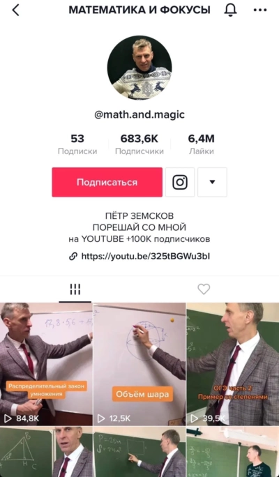 * Интервью записывалось в сентябре, на данный момент у Петра уже 686,6К подписчиков Петр, c чего вообще начиналась Ваша карьера? Карьера начиналась очень просто. В далёком 1986 году я закончил 10 классов и думал, куда поступать. Я подошёл математически к этому вопросу: взял листок бумаги, написал, где у меня хорошо получается, потом посмотрел на этот листок и увидел, что хорошо у меня получается в математике и в баскетболе. Но в связи с тем, что рост мой всего 189 см (даже разыгрывающий практически двухметровый), и я не профессионал в этом деле — принял решение, что надо заниматься математикой, а баскетбол оставлять на любительском уровне. Я поступил в наш педагогический институт в Челябинске, закончил его в 1992 году. С 1989 года, уже после третьего курса, работал параллельно в школе. То есть утром учился, а после 3-4 пар ездил во вторую смену в школу. Вот так потихоньку и стал учителем. Как долго Вы развиваете свой канал? Активно развивать канал в социальных сетях с образовательным контентом я начал с 2017 года. Мы завели с ребятами, школьниками, на перемене канал на YouTube и выкладывали туда выжимки из уроков. Допустим, была такая практика: до конца урока остается 5 минут, а на этом уроке у нас была новая тема, например, мы доказывали какую-нибудь теорему о вписанном угле. И в конце я говорил: «Давайте сейчас запишем ролик», — выходил к доске и давал четкое железное доказательство этой теоремы или какой-то сложной задачи. Самый первый ролик мы просто в беседу ребятам отправили как домашнее задание для подготовки, а потом мальчишки сказали: «Пётр Саныч, зачем нам отправлять? Давайте будем выкладывать в YouTube. Заведём сейчас Вам аккаунт», — мы это сделали. Это действительно увлекательное занятие — вести свой видеоблог. Он становится не только обучающим, но и популяризирующим, потому что сейчас на нашем канале основная масса зрителей — это вообще-то взрослые люди. Даже по статистике смотришь: 24 — 45 лет — самая большая аудитория. Вот где-то в 2019 году я подумал: «Так, пока нет. Пока здесь (в TikTok) люди флексят, рофлят — мы подождём!». А в 2020 TikTok насытился развлекательным контентом, и я подумал, прям почувствовал, что вот сейчас надо заходить с образовательным контентом. Если посмотреть все мои ролики, то каких-то роликов, где я пою и танцую, может быть, один на сотню. Один там какой-нибудь, ну может два — всё! Всё остальное — это выход к доске, строгое решение задачи, строгое доказательство в какой-то моей манере. Поэтому это, наверное, пример, может быть, единственного или, по крайней мере, уникального контента, где в угоду зрителям практически ничего не делается. А может быть, зритель и жаждет? Может, наоборот, я угождают зрителю, когда он хочет нормального, серьезного разговора о математике, какого-то серьёзного нормального объяснения математических примеров. То есть, получается, YouTube — это не только ваша идея, это какая-то совместная идея с вашими учениками в то время была? Да, так можно сказать, совместно. Но и в TikTok меня долго агитировали и ученики, и собственные дети. Они прямо говорили: «Слушай, TikTok — это тема! TikTok — это лидер! Надо! Давай, заходи». Я говорю: «Нет». Знаете, люди моего поколения смотрели фильм «Чапаев» в детстве раз по 5, я, как Анка пулеметчица, говорил: «Нет! Пускай подойдет ближе. Вот сейчас... Вот сейчас». Вот когда я зашёл, 2020 год, январь — это, на мой взгляд, 