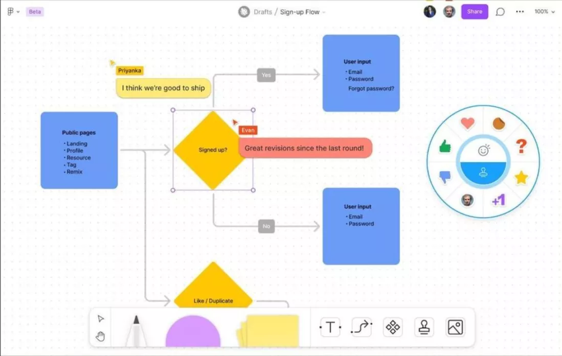 В FigJam есть много функций, которые делают его удобным сервисом для дизайн-мышления на стадии проектирования. Поэтому команды Stripe, Netflix, Salesforce, Twitch и других компаний использовали FigJam для мозгового штурма и формирования идей.