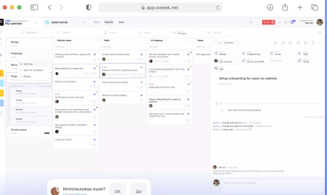 Это тоже интерактивная онлайн-доска, но ее команда создателей осуществила необычную идею: они оцифровали не флипчарт, а само пространство. И в нем есть не только всякие стикеры и фигурки, но еще и общение, совсем как в реальном офисе. По аналогии с компьютерными играми вы управляете своим персонажем в виде аватарки. По виртуальному пространству можно перемещаться, а звук там работает как и в обычном помещении — чем дальше отходите от коллег, тем тише для них звучит ваш голос. И наоборот. Столы, стулья, доски — тут есть все. Обычно общение с коллегами на удаленке возмещается созвонами в том же Zoom, а тут мы получили возможность почувствовать присутствие коллег, работая из дома. Хотя и о созвоне, если нужно, вы сможете договориться — для этого просто подойдите к коллегам и скажите им об этом. Сервис подходит для онлайн-квестов, интерактивных уроков, хакатанов и совместных мозговых штурмов. Платформа для совместной работой над презентациями. На ней можно собираться с коллегами и творить в реальном времени, встраивать в презентацию любые изображение и детали: от прототипов Figma до роликов. Идея разработчиков была в том, чтобы создать удобный и простой в использовании инструмент как для дизайнеров, так и для тех, кому в работе нужны презентации. Фрагменты контента могут быть добавлены: Figma, Unsplash, Framer GIPHY, Dropbox, Google Drive и т. д. Информацию также можно брать из вашей облачной файловой системы или доступных интеграций. Ludus позволяет: Оплата за тариф идет не с каждого пользователя, а за команду сразу. За команду, состоящую из 15 человек, месяц в Ludus будет стоить 14.99 долларов. Сервис для управления личными и командными проектами. Российский аналог Trello, в основе которого лежит канбан-методология: доски, списки и т.д. Методика работы на сервисе простая: открывается воркспейс, внутри него создаются проекты, которые состоят из ряда задач. К каждой прописываются детали, исполнители и сроки окончания. Что еще есть в сервисе? Можно настроить уведомления о новых заданиях или приближении дедлайна. Тогда сервис отправит напоминание в удобный для вас мессенджер. Доступ открыт ко всем инструментам, ограничат вас только в количестве проектов — в бесплатной версии разрешено создать только 7 штук. Сервис для управления проектами от digital-агентства Stik. Делает совместную работу не только удобной, но и прозрачной. Началось с того, что агентству стало трудно ориентироваться среди проектов по заметкам и письмам. Задач становилось больше, штат пополнялся удаленными сотрудниками. Команде захотелось навести порядок и получить возможность отслеживать прогресс по задачам. Пользовались Trello, Битрикс24, Notion, Hubstaff, Monitask. В какой-то момент сервисов стало слишком много, а одного решения, которое бы удовлетворяло все потребности, не нашлось. Да еще и каждый сервис приходилось оплачивать отдельно. В результате было принято решение разработать идеальный инструмент, отвечающий требованиям digital-агентства. Так появился Штаб — сервис, работающий в облаке и на десктопе. Его трекер считывает над какими задачами, сколько работал сотрудник, сколько часов и минут ушло на конкретную задачу. Чтобы следить за рабочим процессом, можно включить создание скриншотов. Раз в определенный интервал программа делает скриншот рабочего стола сотрудника. Задачи в проекте распределяются согласно матрице 