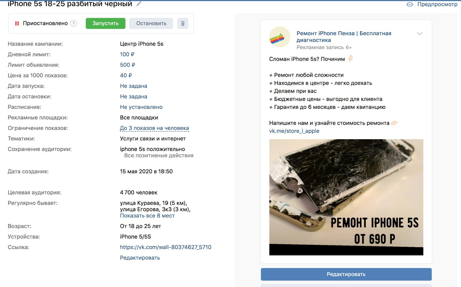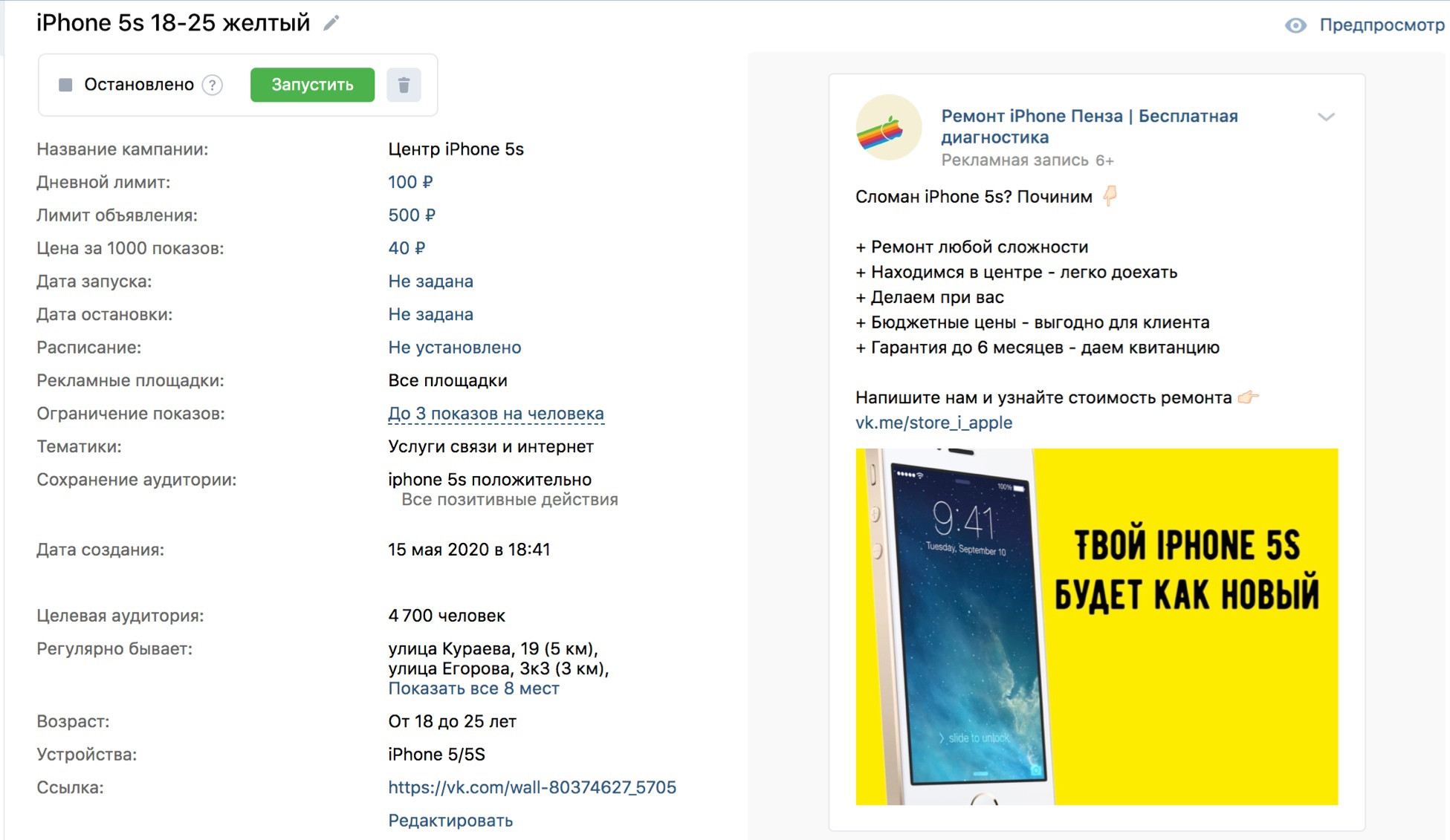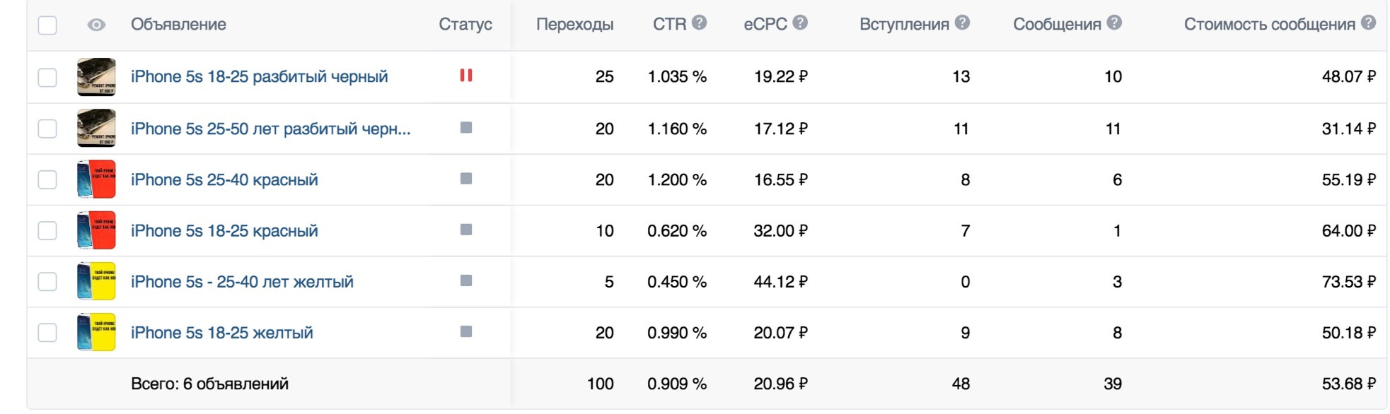 Для начала рассмотрим объявления. Второе объявление: Такое же объявление с разницей в сегментации аудитории с 25 до 40 лет. Третье объявление: В качестве визуала решили использовать красный фон, тригерирующий к действию. На фоне модель телефона, которую предлагаем отремонтировать. Четвертое объявление: Объявление аналогичное третьему лишь с разницей в возрасте аудитории. Пятое объявление: В последних двух объявлениях тот же текст, что и в остальных. Разница заключалась лишь в цвете фона — в данном объявлении мы поместили IPhone на желтый. Шестое объявление: Открутив заданный бюджет до 2000 руб., получили интересные результаты для анализа. Все это время мы имели доступ к обратной связи и могли отследить как сообщения, так и клиентов, которые пришли с нашей рекламной компании. Самые эффективные объявления — это первые два с «живым» изображением разбитого телефона. Результаты практически одинаковы, однако лучше сработало на аудиторию от 18 до 25 лет. В сумме два объявления принесли 45 переходов, 21 сообщение и семь клиентов (двое с заменой дисплея + аккумулятора, с три на замену только дисплея, один с заменой корпуса, один с заменой контроллера питания). Итоговая выручка — 11100 руб. при потраченных 823,25 рублях. Стоимость одного сообщения обошлась в 39,57 рублей. Стоимость одного клиента составил 117,6 рублей. Объявления с красным фоном сработали на две аудитории по-разному. Старшая аудитория 25-40 лет активнее переходила и оставляла сообщения и показала лучший CTR среди всех рекламных креативов. В сумме два объявления принесли 30 переходов, 7 сообщений и 4 клиента (два с заменой контроллера питания, один с заменой стекла и один с заменой дисплея). Итоговая выручка — 6200 рублей при потраченных 651,15 руб. Стоимость одного сообщения обошлась в 59,6 рублей. Стоимость одного клиента 162,75 рублей. Объявления с желтым фоном сработали хуже остальных. Здесь больше активность была у молодой аудитории 18-25 лет. В сумме два объявления принесли 25 переходов, 11 сообщений и 2 клиентов (оба с заменой дисплея). Итоговая выручка — 3700 рублей при потраченных 622 рублях. Стоимость одного сообщения обошлась в 123,7 рублей. Стоимость одного клиента 310,7 рублей. Результаты рекламной компании. Потрачено 2000 рублей, общая выручка — 21 000 рублей. Стоить понимать, что маржинальность в ремонте младшей модели минимальная. Хотя даже при таких ценах РК оправдана и принесла прибыль заказчику. Стоить отметить, что кроме отправки сообщений люди вступали в сообщество. Теперь это наши потенциальные клиенты: рано или поздно они также принесут свои гаджеты на ремонт. При дальнейшей работе в РК нужно будет провести следующие мероприятия: — остановить объявления с желтым фоном, а остальные продолжать крутить увеличивая стоимость за 1000 показов; — увеличить радиус супергео; — придумать другой текст и креативы; — работать с владельцами более старших, а соответственно более маржинальных, моделей iPhone; — использовать специализированные сервисы парсинга для поиска горячих аудиторий; — настроить ретаргетинг. Занимаешься ремонтом? Хочешь, чтоб в твой сервис стояла очередь? Пиши нам и жми «палец вверх»!