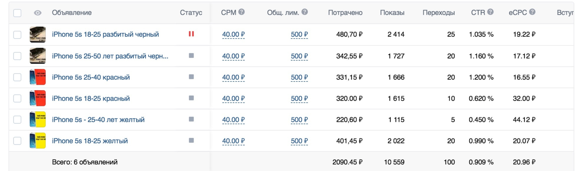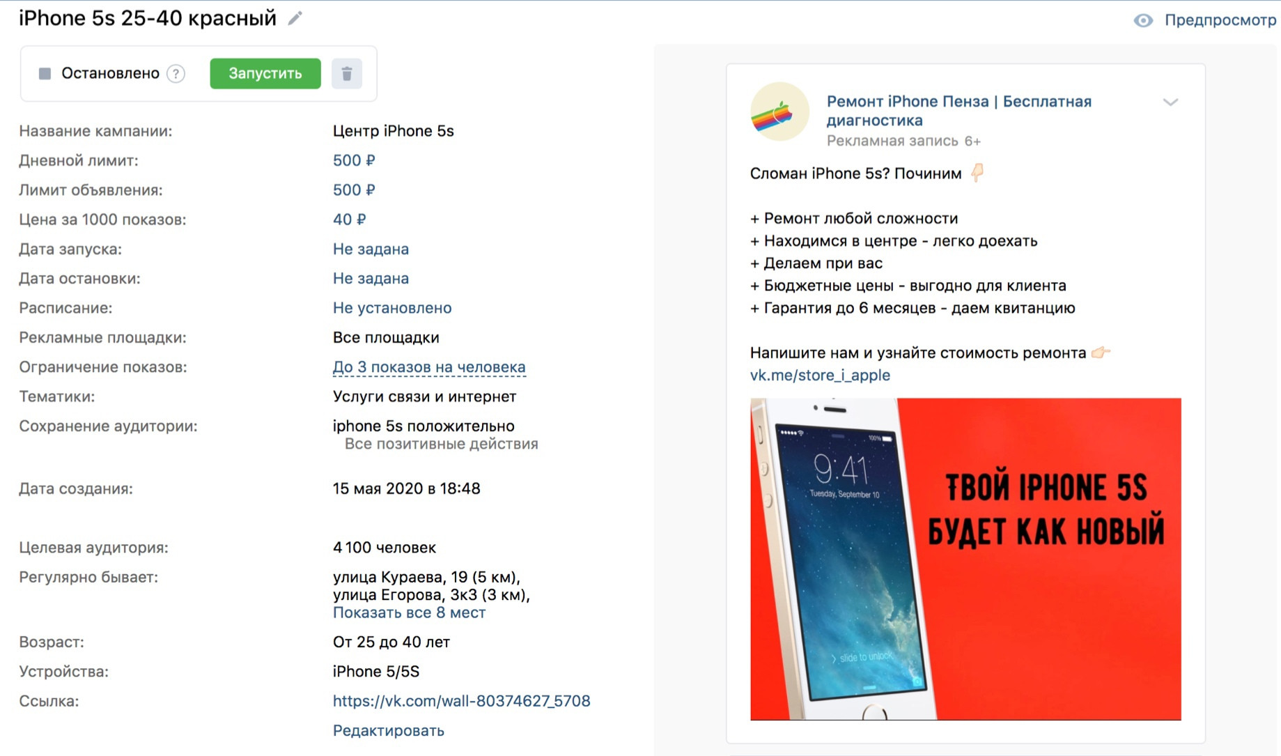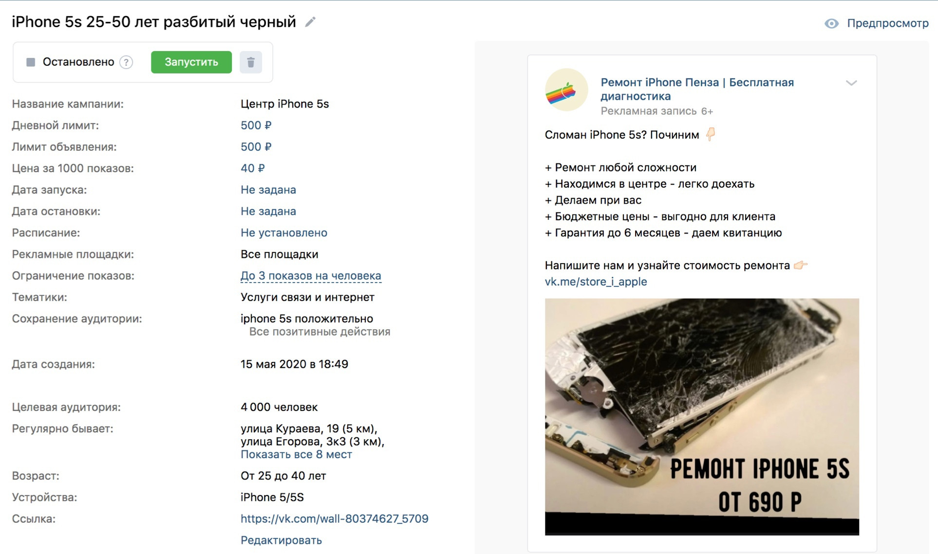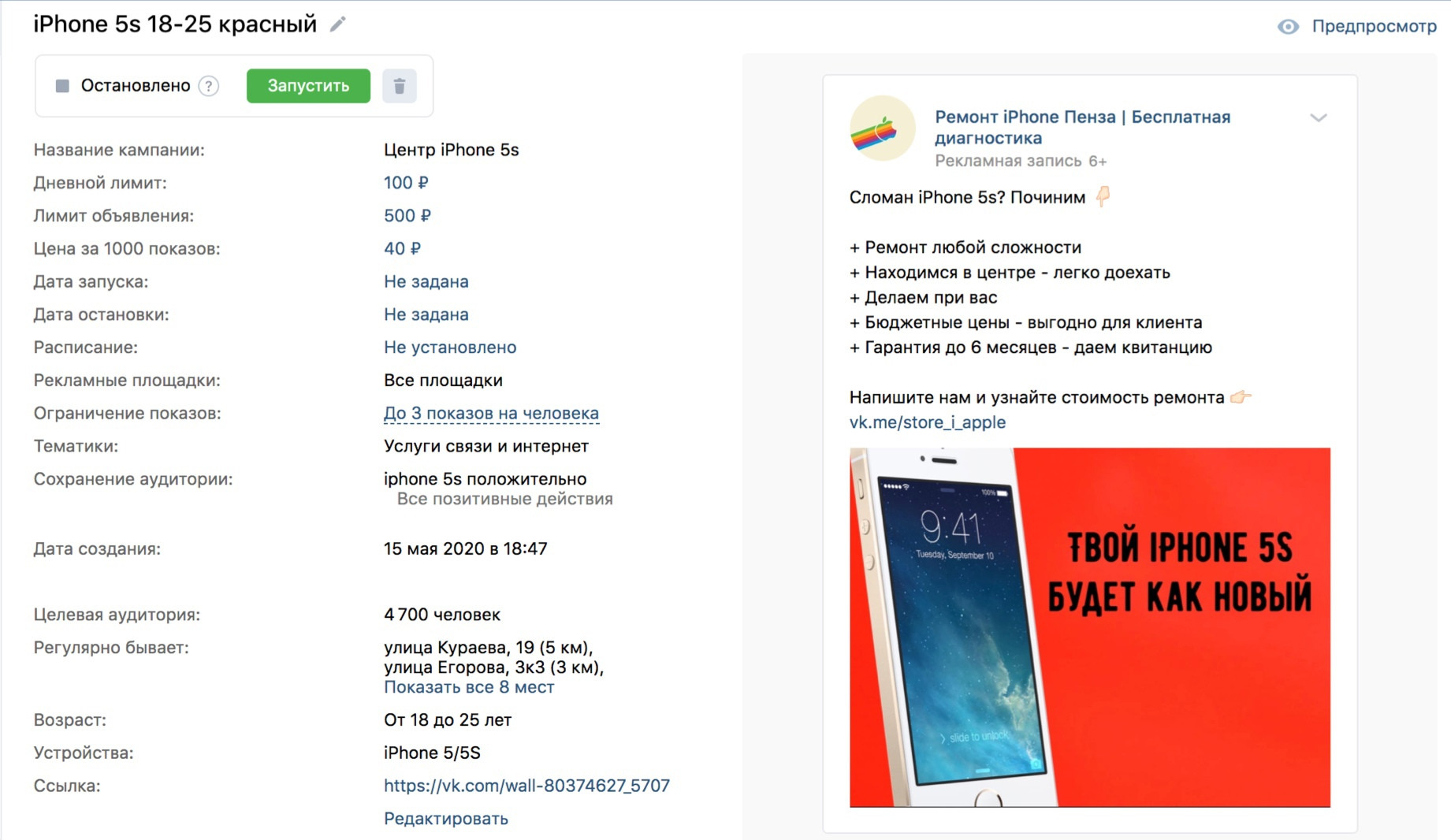 Для начала рассмотрим объявления. Второе объявление: Такое же объявление с разницей в сегментации аудитории с 25 до 40 лет. Третье объявление: В качестве визуала решили использовать красный фон, тригерирующий к действию. На фоне модель телефона, которую предлагаем отремонтировать. Четвертое объявление: Объявление аналогичное третьему лишь с разницей в возрасте аудитории. Пятое объявление: В последних двух объявлениях тот же текст, что и в остальных. Разница заключалась лишь в цвете фона — в данном объявлении мы поместили IPhone на желтый. Шестое объявление: Открутив заданный бюджет до 2000 руб., получили интересные результаты для анализа. Все это время мы имели доступ к обратной связи и могли отследить как сообщения, так и клиентов, которые пришли с нашей рекламной компании. Самые эффективные объявления — это первые два с «живым» изображением разбитого телефона. Результаты практически одинаковы, однако лучше сработало на аудиторию от 18 до 25 лет. В сумме два объявления принесли 45 переходов, 21 сообщение и семь клиентов (двое с заменой дисплея + аккумулятора, с три на замену только дисплея, один с заменой корпуса, один с заменой контроллера питания). Итоговая выручка — 11100 руб. при потраченных 823,25 рублях. Стоимость одного сообщения обошлась в 39,57 рублей. Стоимость одного клиента составил 117,6 рублей. Объявления с красным фоном сработали на две аудитории по-разному. Старшая аудитория 25-40 лет активнее переходила и оставляла сообщения и показала лучший CTR среди всех рекламных креативов. В сумме два объявления принесли 30 переходов, 7 сообщений и 4 клиента (два с заменой контроллера питания, один с заменой стекла и один с заменой дисплея). Итоговая выручка — 6200 рублей при потраченных 651,15 руб. Стоимость одного сообщения обошлась в 59,6 рублей. Стоимость одного клиента 162,75 рублей. Объявления с желтым фоном сработали хуже остальных. Здесь больше активность была у молодой аудитории 18-25 лет. В сумме два объявления принесли 25 переходов, 11 сообщений и 2 клиентов (оба с заменой дисплея). Итоговая выручка — 3700 рублей при потраченных 622 рублях. Стоимость одного сообщения обошлась в 123,7 рублей. Стоимость одного клиента 310,7 рублей. Результаты рекламной компании. Потрачено 2000 рублей, общая выручка — 21 000 рублей. Стоить понимать, что маржинальность в ремонте младшей модели минимальная. Хотя даже при таких ценах РК оправдана и принесла прибыль заказчику. Стоить отметить, что кроме отправки сообщений люди вступали в сообщество. Теперь это наши потенциальные клиенты: рано или поздно они также принесут свои гаджеты на ремонт. При дальнейшей работе в РК нужно будет провести следующие мероприятия: — остановить объявления с желтым фоном, а остальные продолжать крутить увеличивая стоимость за 1000 показов; — увеличить радиус супергео; — придумать другой текст и креативы; — работать с владельцами более старших, а соответственно более маржинальных, моделей iPhone; — использовать специализированные сервисы парсинга для поиска горячих аудиторий; — настроить ретаргетинг. Занимаешься ремонтом? Хочешь, чтоб в твой сервис стояла очередь? Пиши нам и жми «палец вверх»!