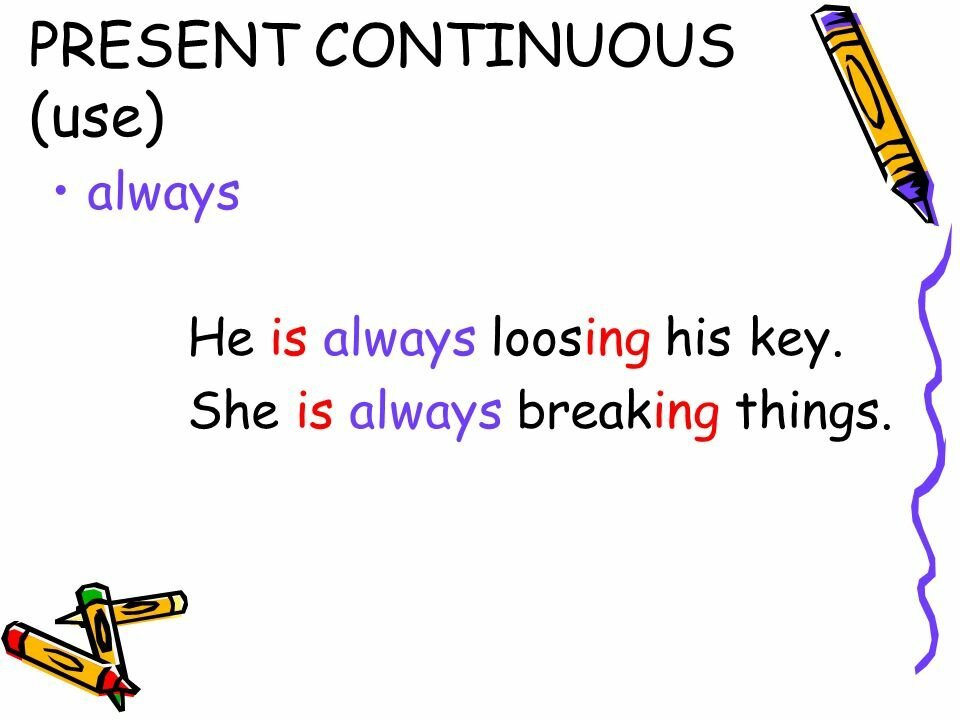 Однако иногда маркеры могут быть одинаковыми для разных времен, и чтобы избежать путаницы, необходимо обращать внимание и на смысл всего высказывания. Один из таких маркеров — наречие always, которое характерно и для Present Simple, и для некоторых случаев Present Continuous.