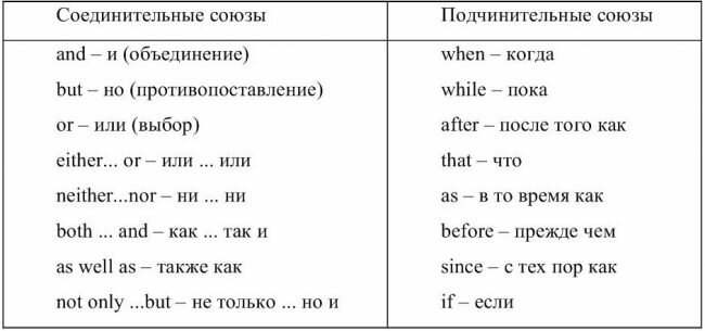 Чаще всего в английском используются союзы and, but, or, so, because.