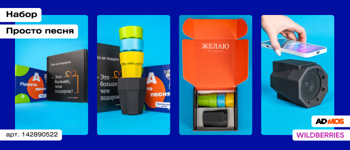 - «Просто песня» — этот мерч-комплект можно подарить целому отделу и сделать пятничные и праздничные посиделки максимально приближенными к идеалу: 3 разноцветных стакана из экопластика и индукционная колонка, для которой не нужно Bluetooth-соединение;