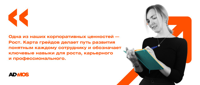 Новички ADMOS, которые приходят в продажи, продакшн и дизайн, получают трек развития. Так они могут сразу оценить возможность карьерного и профессионального роста и понимают, что ждёт от них компания. Всё это прописано в карте грейдов, как и условия перехода на следующий. Ежегодно 1 апреля мы пересматриваем грейды, и переводим сотрудников, которые прокачали soft и hard skill-ы, на следующую ступень.