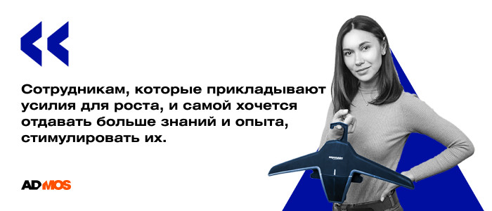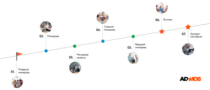 Пока грейдовая система доступна не во всех департаментах. Например, мы ещё не придумали, как простроить карьерный рост для одиночных позиций. В любом случае, все сотрудники должны видеть перспективу, поэтому мы составляем ИПР, индивидуальные планы развития, и рассматриваем не только рост внутри отдела, но и переход между департаментами. Как же выглядит профессиональный рост сотрудника в этих отделах ADMOS? Как можно расти в отделах продаж Путь начинается с позиции младшего менеджера. Для начала хватит базового уровня владения необходимыми программами, знания техники и этапов продаж, коммуникабельности, грамотности, ответственности и целеустремленности. Из специфического придётся выучить стандартных поставщиков по ключевым товарным категориям и брендам и уметь рассчитывать стоимость основных видов нанесения. Потом идут грейды менеджера, менеджера проекта, старшего менеджера, ведущего менеджера и наконец эксперта/эксперта-наставника. Здесь уже придётся продемонстрировать высокий уровень навыков аналитики эмоционального интеллекта, а также уметь обучать и выполнять функции наставника. В продакшн сотрудников ждёт похожий путь Почти аналогичная карта развития предлагается менеджерам отделов продакшн: младший менеджер отдела закупок, менеджер, менеджер проекта, старший менеджер, ведущий менеджер и эксперт. Компетенции схожи с требованиями для менеджеров отделов продаж, но акцент делается на умении искать поставщиков и оценивать их потенциал. В департаменте дизайна тоже можно расти и совершенствоваться: Новичок, который пришёл готовить макеты в отдел ТЗ, может стать дизайнером, а потом старшим дизайнером. Или — перейти в подразделения полиграфии либо креатива. В этих отделах всё начинается с грейда младшего дизайнера. Креативщики готовят макеты нестандартных позиций, визуализируют наборы, «брифятся» и «штурмят». Полиграфисты верстают, делают стандартные макеты и контролируют макеты клиентов, готовят их в производство. Далее — дизайнер, старшего дизайнер, премьер-дизайнер, которые работают над стратегическими задачами, обучают сотрудников и общаются с клиентами.