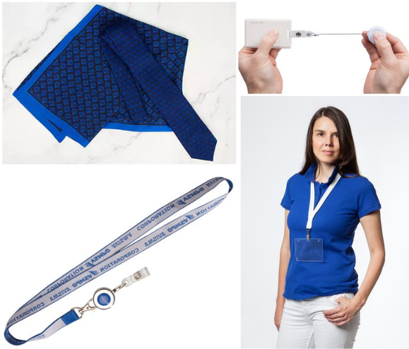 Дизайн стенда, корпоративная полиграфия, одежда сотрудников должны быть выдержаны в едином стиле и выглядеть концептуально. Помимо футболок, кепок, платков и прочего текстиля обязательно забрендируйте не менее говорящие детали: ретракторы, ланьярды и бейджи. Его дополнят корпоративные визитки и фирменная полиграфия.