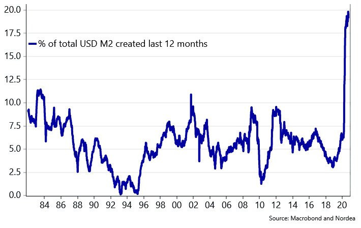 Привычные нам бумажные деньги имеют инфляционную природу. Это значит, что их общая масса только увеличивается со временем, поэтому и ценность единицы такой валюты падает. Только за 2020 год количество напечатанных долларов США составило почти 20% всей долларовой массы, существующей на сегодня в мире. Это отражает график ниже.