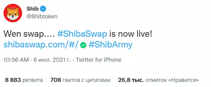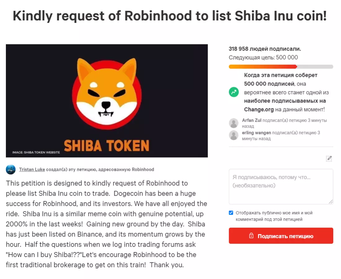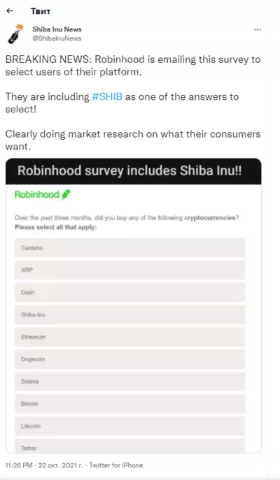 наверстывать упущенное примерно в то время, когда генеральный директор Tesla Илон Маск и другие известные личности начали проявлять интерес к Dogecoin. Технический миллиардер Маск, одним из самых ярых сторонников Dogecoin, прозванный «Dogefather», даже был избран новым неофициальным генеральным директором проекта. Наибольшую огласку Shiba Inu получила история, случившаяся в марте 2021 года в Twitter Илона Маска. Маск опубликовал пост о своем намерении купить собаку породы сиба-ину, которая является символом Dogecoin. Трейдеры же, по всей видимости, решили, что речь идет о новом токене Shiba Inu, что и вызвало массовые покупки этого актива. Хотя недоразумение разрешилось, рост уже было не остановить. После этой публикации цена токена Shiba Inu (SHIB) за час выросла на 68%. Через два дня SHIB подорожал на безумные 1223%, до 0,000019, как раз в преддверии шоу Saturday Night Live с участием Маска. За пять дней цена SHIB выросла более чем на 2 000%. Впоследствии, цена монеты упала вместе со всем рынком, вызванным заявлением Маска о том, что Tesla больше не будет принимать Биткоин в качестве формы оплаты. Позднее, в первую неделю октября 2021, монета восстановила часть утраченной стоимости, когда Маск поделился фотографией и именем своего нового щенка породы шиба-ину. В целом, с января по октябрь цена SHIB выросла более чем на 27 000 000%. Создатели сиба-ину создали экосистему из трех монет, известных как SHIB, LEASH и BONE, и децентрализованную биржу под названием ShibaSwap. На странице ShibaSwap доступно 6 функций, включая три собственных монеты экосистемы: Илон Маск, его страничка в Twitter и размещённая на ней одна фотография 4 октября щенка шиба-ину оказалось достаточно для того, чтобы мемная цифровая монета вошла в топ-20 главных криптовалют мира. В октябре 2021 года, неизвестный крупный покупатель потратил 1,2 миллиона долларов на покупку 49,9 миллиарда монет SHIB. А после этого начался очередной крупный взлет цены на SHIB. «Трейдеры ожидают очередного взлета SHIB», — сообщает также FX Street. Недавно сообщество Shiba Inu (SHIB) опубликовало пост в Twitter о том, что приложение Robinhood может рассмотреть возможность добавления монеты «Dogecoin killer» в список торговых активов. @ShibalnuNews опубликовали скрин опроса, который был отправлен ему по электронной почте. На нем хорошо видно, что Robinhood явно изучает рыночные предпочтения своих клиентов в отношении криптовалют. В опросе спрашивается, покупали ли пользователи какую-либо криптовалюту из списка