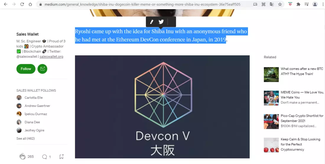у Shiba inu, на конец октября 21-го года, проект-«аутсайдер» сумел создать и развить большое сообщество менее чем за два года с момента создания. Во время официального запуска в августе 2020 году было отчеканено в общей сложности 1 квадриллион токенов SHIB. Чтобы вы понимали: квадриллион — это число, за которым следуют 15 нулей. Шиба-ину был запущен в августе 2020 года как прямой конкурент Dogecoin. Официальный создатель монеты — анонимное лицо, подписывавшийся «RYOSHI». Однако, анонимным созданием Shiba Inu занимался еще один человек, которого Райоши называл своим «неизвестным другом», а позже упомянул, как «очень влиятельного человека в криптоиндустрии», которого он встретил на конференции Ethereum DevCon conference, Japan, 2019. По словам Райоши, SHIB обладает «способностью многократно опережать стоимость Dogecoin, даже не преодолевая отметку в 0,01 доллара». Для сравнения: на сегодняшний момент SHIB торгуется за 0,00003798 доллара, что конечно все еще далеко от 0,01 доллара. И все же