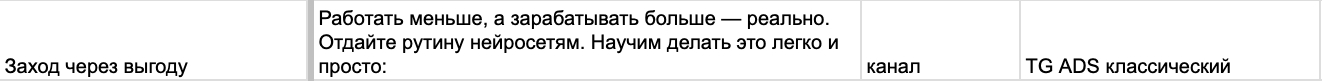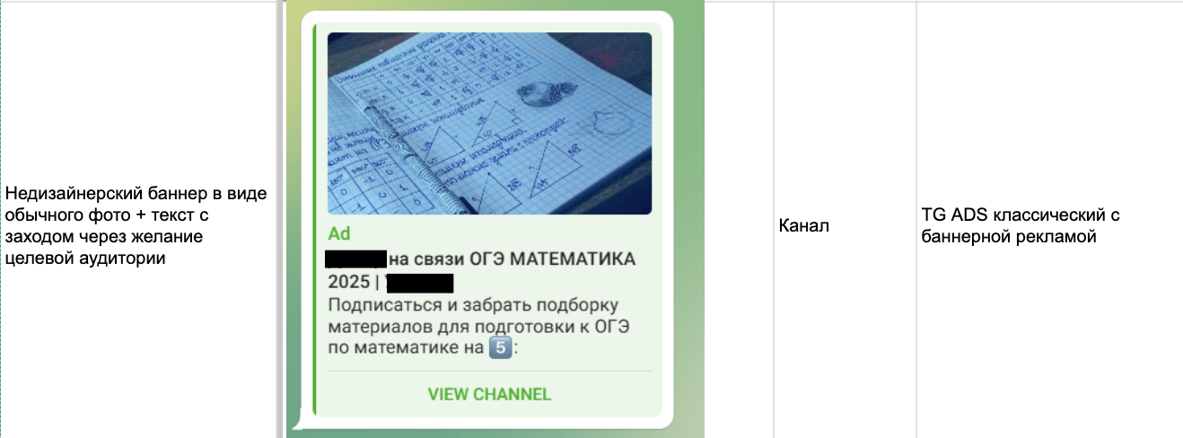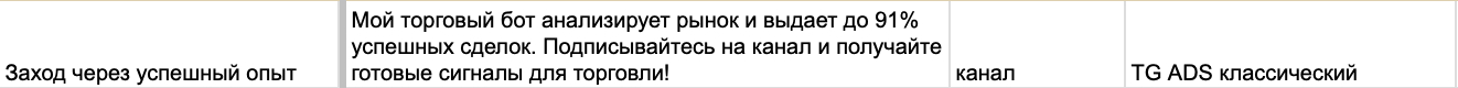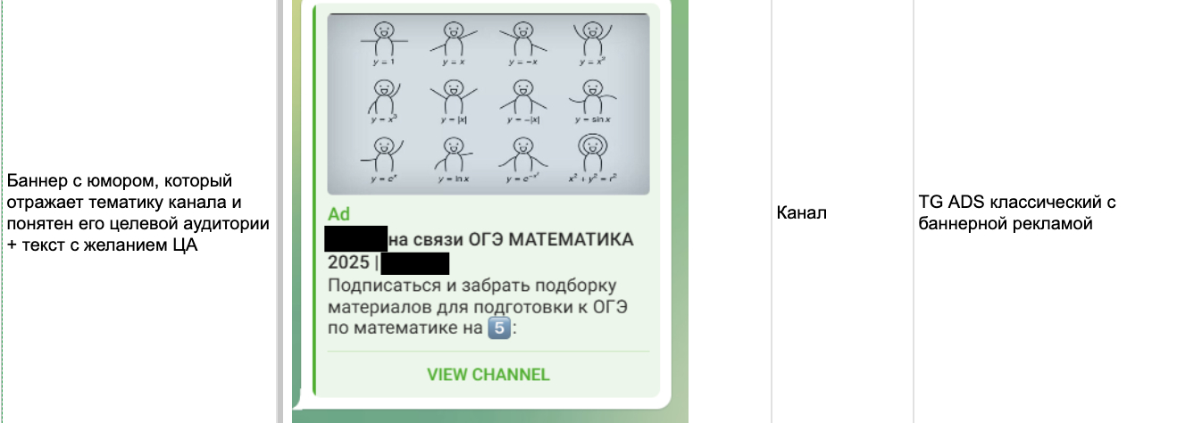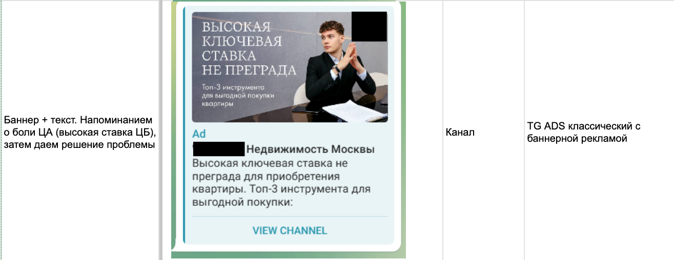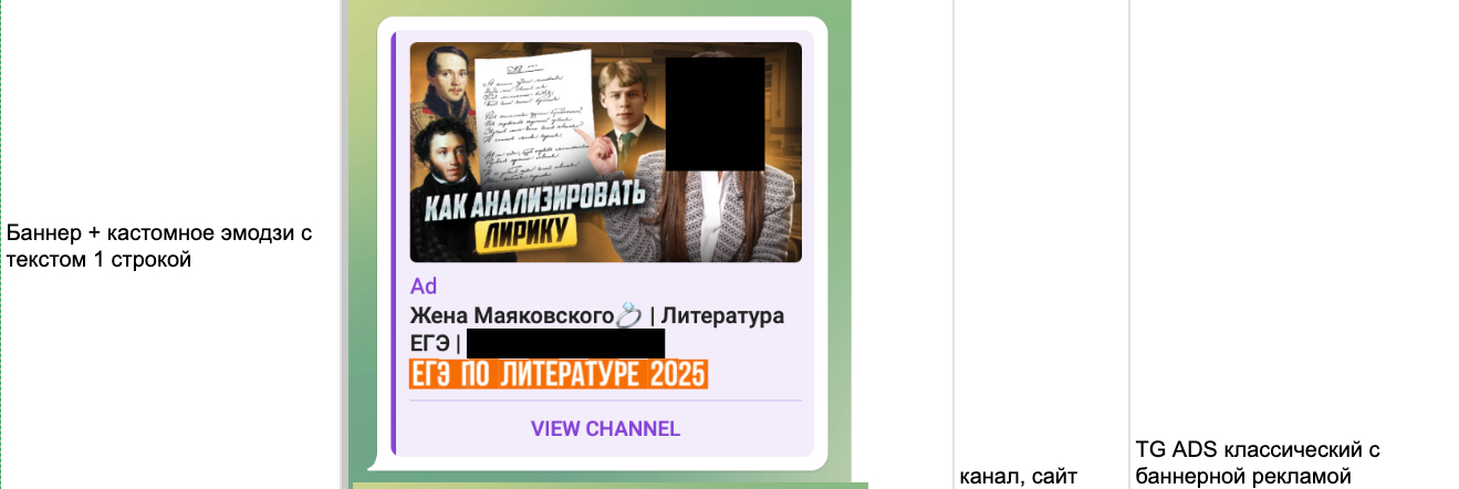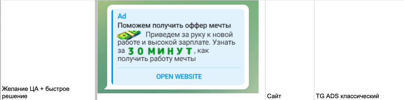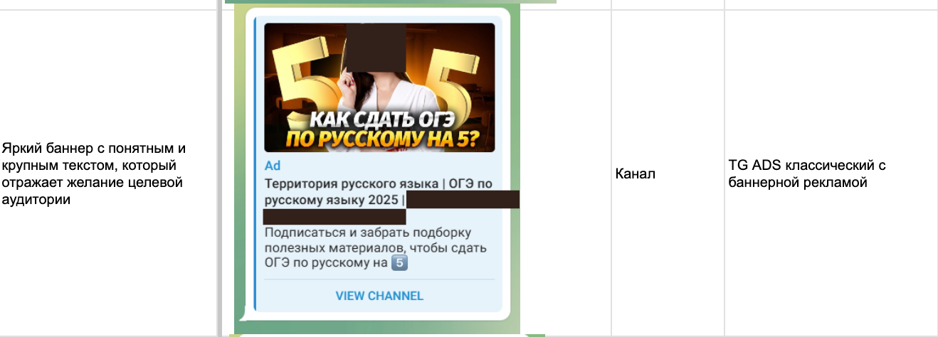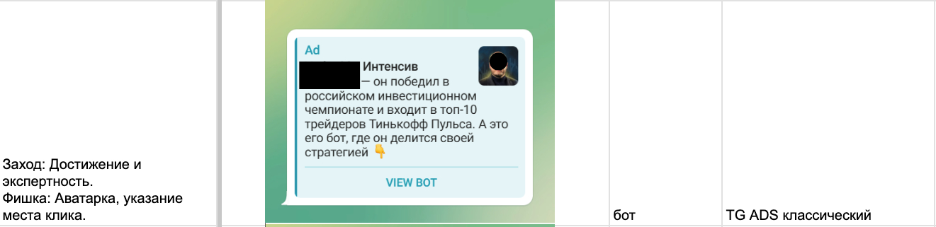 3. Выгода В этом случае нам важно подчеркнуть боль клиента и показать, какую выгоду он получит от её решения. 4. Обещание нового навыка Здесь комментарии излишни. Подчёркиваем ценность профессионального или личностного роста и предлагаем изучить новый ценный навык. 5. Польза (получение новой информации) Быть в курсе событий и узнавать новое — это одна из главных причин, зачем люди читают каналы в Telegram. Найдите тех, кто заинтересован в вашей теме и пообещайте им эту пользу. Так как конкуренция в этой сфере высока — не будет лишним дополнительно простимулировать подписку призами или скидками. 6. Польза (для здоровья) В этой нише важно использовать более спокойные и сдержанные креативы. Ведь модерация крайне внимательно относится ко всему, что связано с темой здоровья. 7. Заход через экспертность и актуальную тему Здесь всё просто — поднимаем актуальный вопрос, который волнует нашу целевую аудиторию, а затем показываем, что у нас есть экспертный ответ на него. 8. Заход через пользу и самопознание Подчёркиваем пользу будущего результата и призываем подписаться на канал. 9. Необычные эмодзи, которые пробивают баннерную слепоту Добавляем к объявлению необычные кастомные эмодзи. Иногда можно даже целое объявление составить из таких графических значков. Методика очень действенная. Но не всегда удаётся пройти модерацию, если эмодзи будет слишком много. 10. Обращение к авторитету по теме В этом случае мы подчёркиваем регалии и экспертность нашего спикера, чтобы убедить аудиторию подписаться. 11. Обращение к ЦА напрямую Очень действенный заход. Но использовать его нужно аккуратно, так как могут возникнуть проблемы с прохождением модерации. Telegram не любит, когда мы прямо обозначаем ЦА. Если объявление не прошло — лучше немного подождать. Обычно модерация становится более лояльна через месяц после запуска первых объявлений в работу. 12. Обещание быстрого решения проблемы Ещё одна беспроигрышная схема. Ударьте в боль или потребность ЦА и предложите быстрое решение проблемы. 13. Объявление с аватаркой Нужно продать эксперта? Добавьте к рекламе аватарку с его лицом. В тексте подчеркните его заслуги или расскажите об истории успеха 14. Баннер с оффером Решили привлечь внимание баннером, но не знаете, что на нём разместить? Самый простой и очевидный вариант — вынести на картинку ваш ключевой оффер, отражающий желание целевой аудитории. 15. Баннер, бьющий в боли аудитории Ещё один классический вариант — на баннере мы бьём в боль аудитории. В тексте объявления — предлагаем решение. 16. Баннер + кастомные эмодзи Можно ли усилить эффект от баннера и зацепить ещё больше внимания? Да! Подключайте кастомные эмодзи! 17. Простецкий баннер Ещё один способ привлечь внимание к своему объявлению — использовать вместо «дизайнерского» баннера обычную фотографию. Удивительно, но живое фото часто привлекает к себе больше внимания, чем профессиональный баннер. 18. Юмористический баннер Не обязательно выносить на баннер свой оффер или промо-материалы. Иногда достаточно добавить смешную картинку с юмором, понятным вашей целевой аудитории. Это не только привлечёт внимание, но и создаст позитивную эмоциональную связь для восприятия вашего оффера, который вы разместите в тексте под изображением. 19. Баннер с новостным тизером Telegram — это главный источник новостей для мн