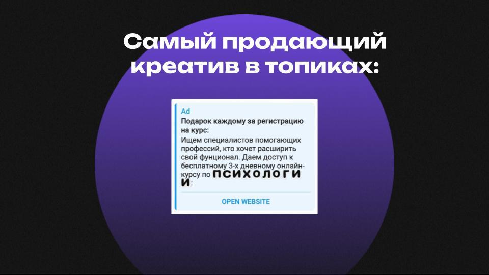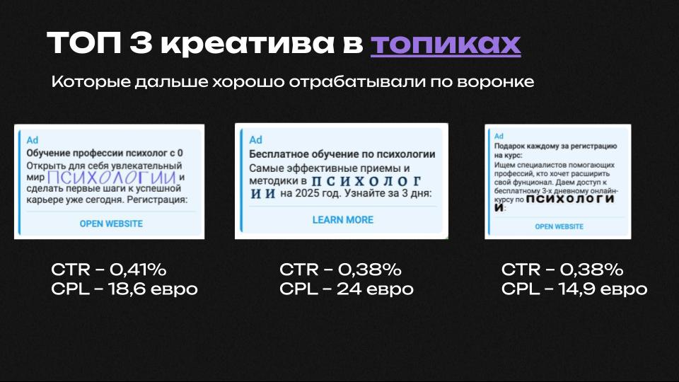 1. Низкая конверсия из кликов в лиды Изначально конверсия составляла всего 9,71%. Это означало, что из 100 посетителей посадочной страницы лишь около 10 оставляли заявку. Такая эффективность не позволяла выстроить устойчивую воронку продаж: стоимость привлечения лида (CPL) оставалась нестабильной, а кампания не окупалась. 2. Нерелевантные креативы Во время предыдущих запусков пытались использовать единые креативы для всех сегментов аудитории, что, вероятно, стало ключевой причиной высокой стоимости лида. 3. Слабая посадочная страница Структура лендинга плохо подчеркивала УТП клиента, оффер был спрятан внизу страницы, было сложно понять предлагаемые преимущества.4. Долгий цикл сделки и слабые дожимыЦикл сделки по проекту превышал 2 недели. Дожимы были реализованы слабо. Отправка одного электронного письма после заявки не могла эффективно трансформировать теплые лиды в оплату. 1. Переработка посадочной страницы Посадочная страница была полностью переосмыслена с учётом потребностей целевой аудитории.Основные изменения включали: 2. Усиление офферов Мы добавили конкретные и привлекательные предложения, такие как «Получите диплом MBA в области психологии» или «Освойте профессию психолога за 6 месяцев с нуля». Эти формулировки подчёркивали ценность обучения и конкретные результаты. 3. Работа с болевыми точками На верхнюю часть страницы были вынесены блоки, напрямую обращающиеся к проблемам аудитории: «Чувствуете, что ваша карьера застопорилась?» или «Мечтаете помогать людям, но не знаете, как начать?». Это сразу привлекало внимание и создавало эмоциональную связь. 4. Улучшение UX/UI Навигация стала более интуитивной: мы упростили структуру, сократили количество полей в форме заявки с 5 до 3 и добавили заметные кнопки с призывами к действию, такими как «Записаться сейчас» или «Узнать подробности». Цветовая схема была переработана для повышения читаемости и акцента на ключевых элементах. 5. Доказательства успеха Мы интегрировали отзывы выпускников и статистику, например, «85% наших студентов находят работу в течение 3 месяцев после выпуска», чтобы повысить доверие. Трафик решили запускать на собранные вручную подборки каналов. Целевые каналы собирали из поиска и из подборок TG Stat. Затем анализировали их вручную и при помощи специальных сервисов, отсеивая блоги с некачественной аудитории. Затем подборки каналов мы разделили на отдельные пулы: ✔️ институты психологии ✔️ академии психологии ✔️ личные блоги психологов, которые активно обучают и имеют свою академию ✔️ каналы для психологов (тематические, а не массовые — про продвижение, обучение и так далее) ✔️ академии/университеты коучинга ✔️ каналы для коучей (тематические про контент, литературу и тд. исключительно для психологов) Дополнительно решили протестировать сбор аудитории с широких топиков: Выбрали 2темы: ✔️ психология ✔️ обучение Дополнительно мы разделили целевую аудиторию на несколько сегментов: Молодые специалисты (25–35 лет) Люди, интересующиеся саморазвитием и психологией как инструментом личностного роста. Для них акцент делался на карьерных перспективах. Профессионалы из смежных областей (35–45 лет) HR-специалисты, коучи и педагоги, желающие переквалифицироваться. Кампания подчёркивала практическую применимость знаний. Родители и люди старше 45 лет Те, кто 