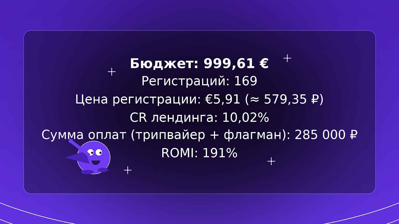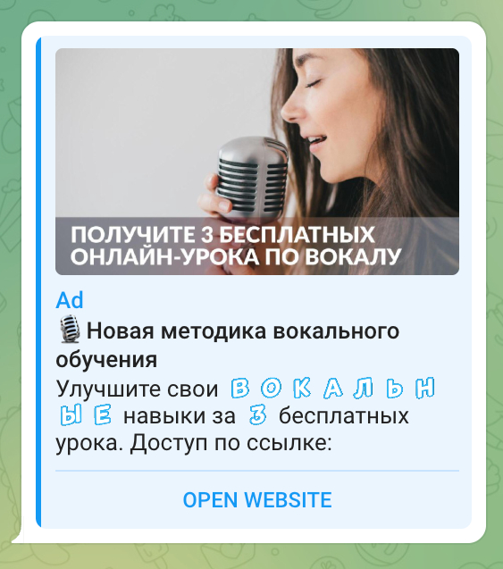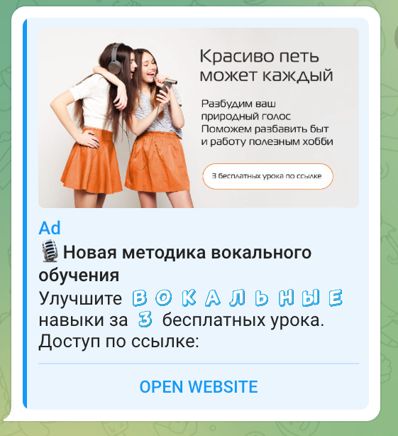 Мы решили продвигаться при помощи баннерной рекламы.Все изображения решили разделить на 2 типа:Первый — аккуратные дизайнерские баннеры с ровными шрифтами и красивой композицией: Второй — простой формат, где есть живое фото и короткая, понятная мысль: Второй вариант, в итоге, сработал лучше.Приводим статистику по креативам в дизайнерском и недизайнерском формате: Предполагаем, что второй вариант креативов выглядел не как реклама, а как человеческое приглашение, и поэтому вызывал больше доверия.Каким принципам мы следовали: Эта проверенная формулировка отлично показывает себя во многих наших кейсах в различных нишах. И проект по вокалу не стал исключением. Получив хорошие результаты на начальных тестах, мы приступили к масштабированию. И почти сразу столкнулись с проблемой. Из-за узости темы подборки начали быстро выгорать.Что мы предприняли, чтобы справиться с этой проблемой: Эти действия помогли стабилизировать кампанию и замедлить выгорание связок, что дало стабильные результаты. Период: 20.07.25–01.09.25 (43 дня) Регистраций: 169Цена регистрации: €5,91 (≈ 579,35 ₽) CR лендинга: 10,02%Сумма оплат (трипвайер + флагман): 285 000 ₽ROMI: 191% Несмотря на то, что CPL кампании получился чуть выше KPI, кампания всё равно отлично окупилась. К тому же, мы получили много ценных данных, на основе которых мы составили карту работающих аудиторий.Какие инсайты мы получили из этого кейса? Поделитесь этим кейсом с друзьями. Пусть он послужит для них вдохновением!Остались вопросы по этому кейсу? Хотите увидеть другие проекты в вашей нише? Хотите, чтобы мы проанализировали ваш проект и составили конкретный план, как быстро достичь желаемых вами бизнес-показателей? Пишите нам сюда— мы проведём бесплатную консультацию, на которой разберём ваш проект, покажем точки роста и обрисуем план быстрого достижения желаемых вами бизнес-метрик! SMIT.Link — это:250+ успешных проектов и 600+ млн рублей реализованного рекламного бюджета. С нами вы пройдёте модерацию в Telegram Ads всего за 1 день. А наша уникальная система сквозной аналитики Telegram поможет вам получить самую глубокую и надёжную статистику по запущенным рекламным кампаниям.