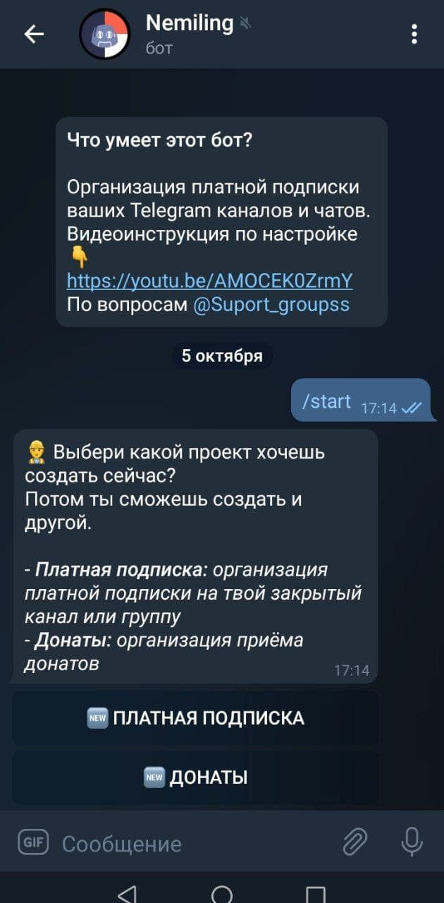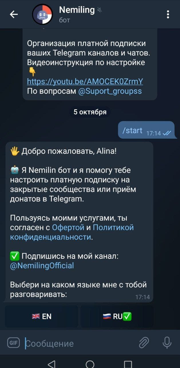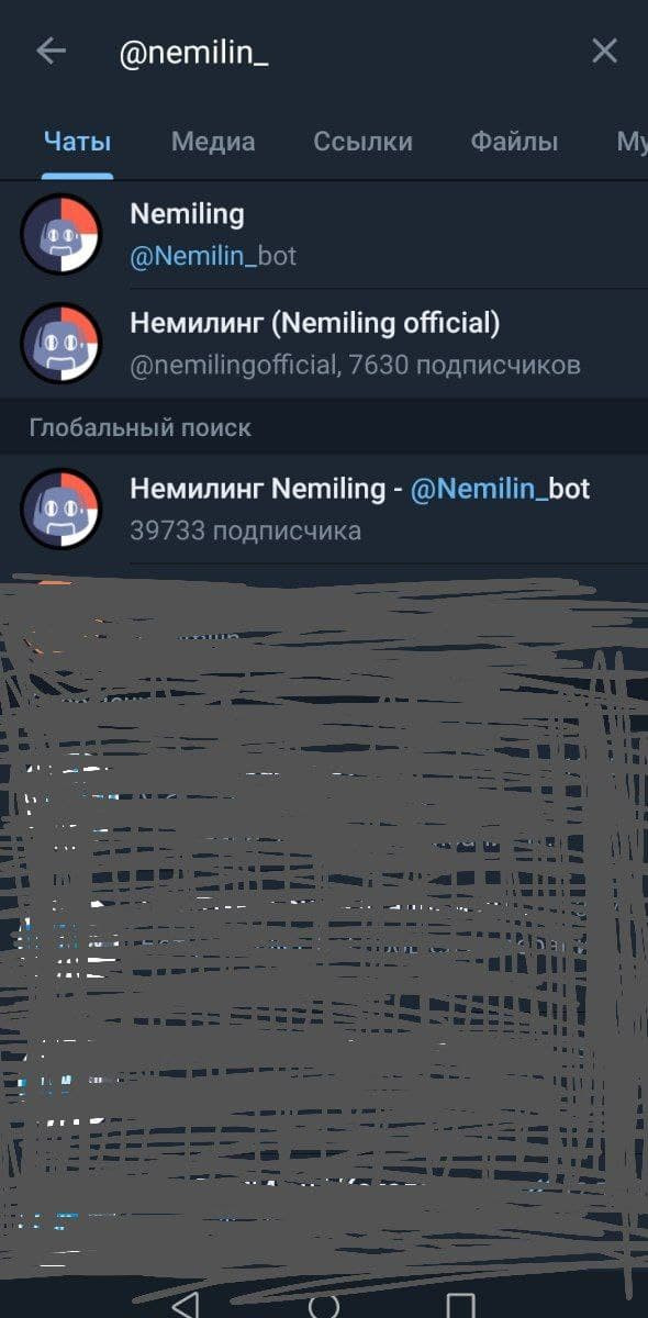2-ввести в поисковой строке @nemilin_bot 3-нажать кнопку старт С донатами разобрались! Что же касается платного доступа - это флагман бота Немилинг! -Полная автоматизация -Деньги так же приходят прямиком на ваш электронный кошелёк -Но тут, в отличии от донатов, уже есть лимит 5.000 рублей в месяц. То есть, при условии что ваш заработок с подписок выше пяти тысяч рублей, вы можете расширить свои возможности: 1.500 — лимит до 60.000 2.500 — безлимитный оборот О платном доступе в Telegram есть отдельные статьи, вам же стоит понять что в наши дни заработок с телефона, это вполне реально и просто!