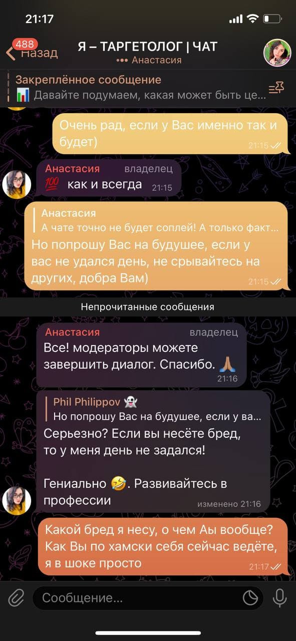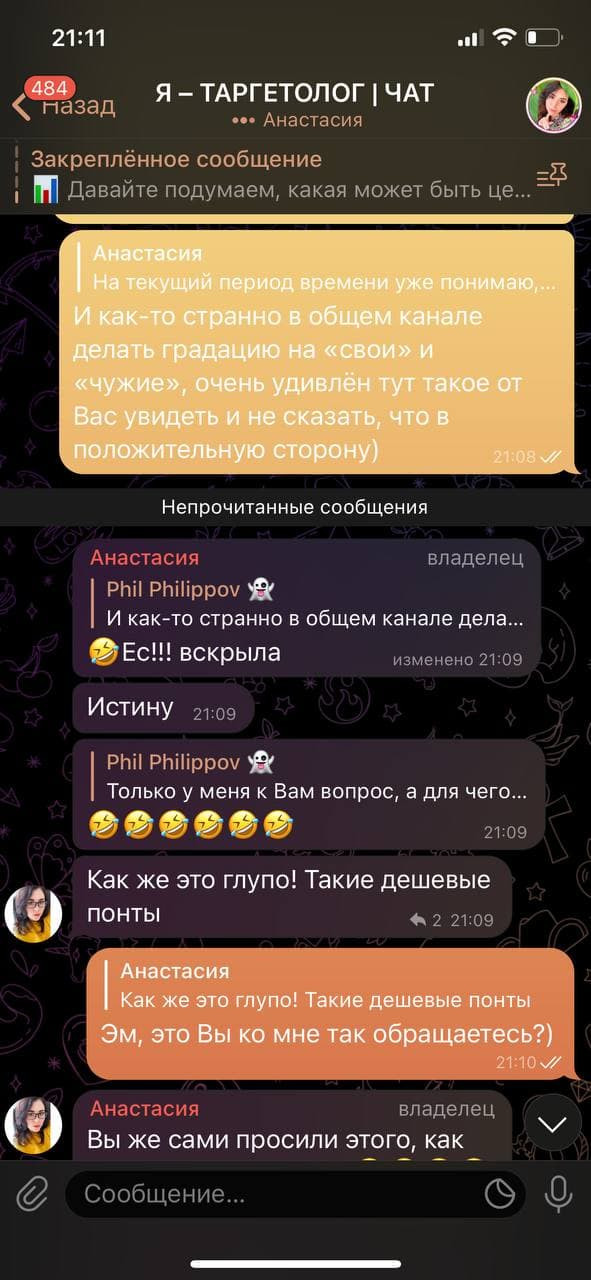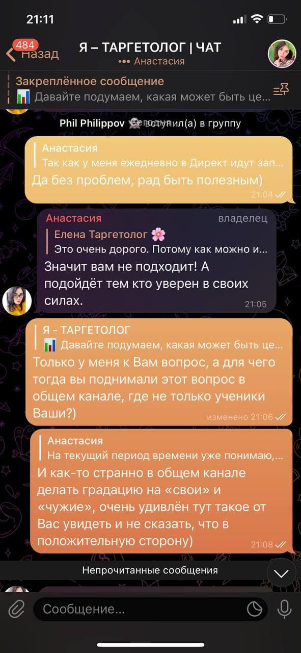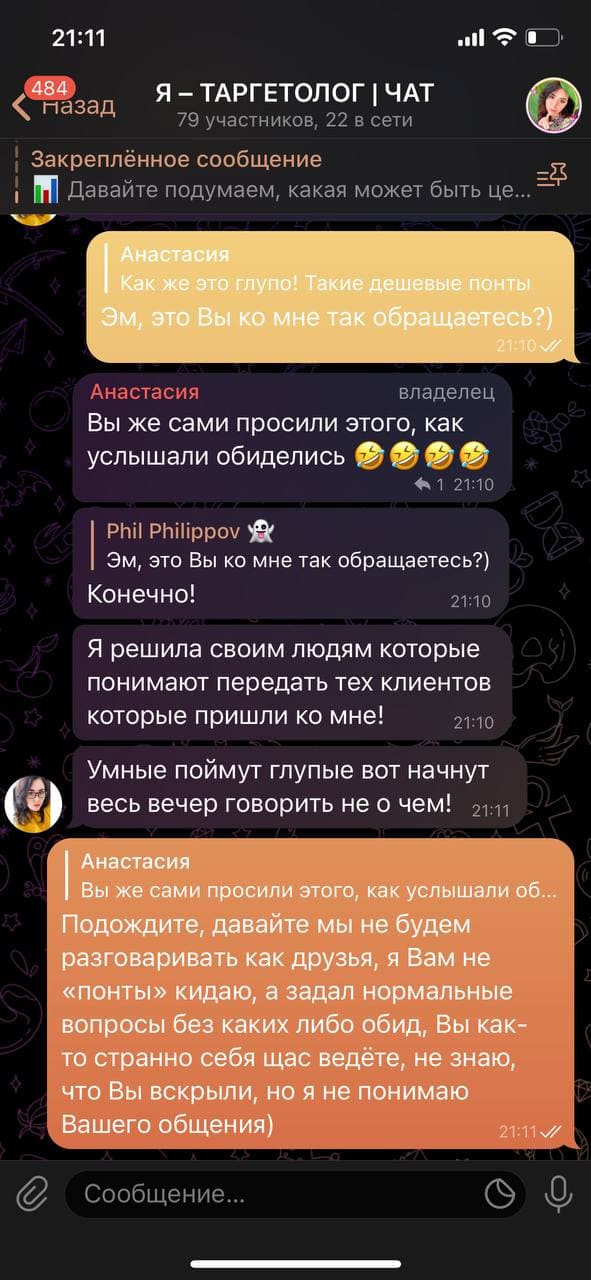 В общем канале было предложение создать чат для таргетологов, куда будут добавлены клиенты, которые ищут специалистов в этой сфере для дальнейшего запуска рекламы. Обсуждалась цена входа в этот чат. Градация была 5тыс. 8тыс. и 12тыс.(цифры близки к реальным). Естественно комментарии открыты, значит можно поделиться своим мнением, чем я и воспользовался. Озвучил, что если чат будет формата «базара» то ему красная цена будет 5 тыс. р., т.к. конкуренция, нужно сидеть и бороться за клиента и т.д. А дальше рассказ будет в скринах, сделанных из этого чата. Все они будут подписаны в хронологическом порядке.