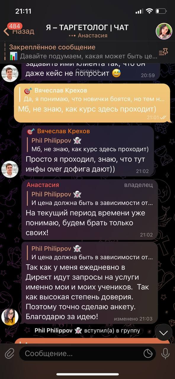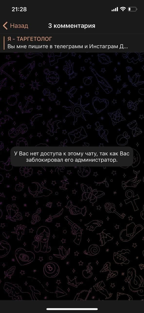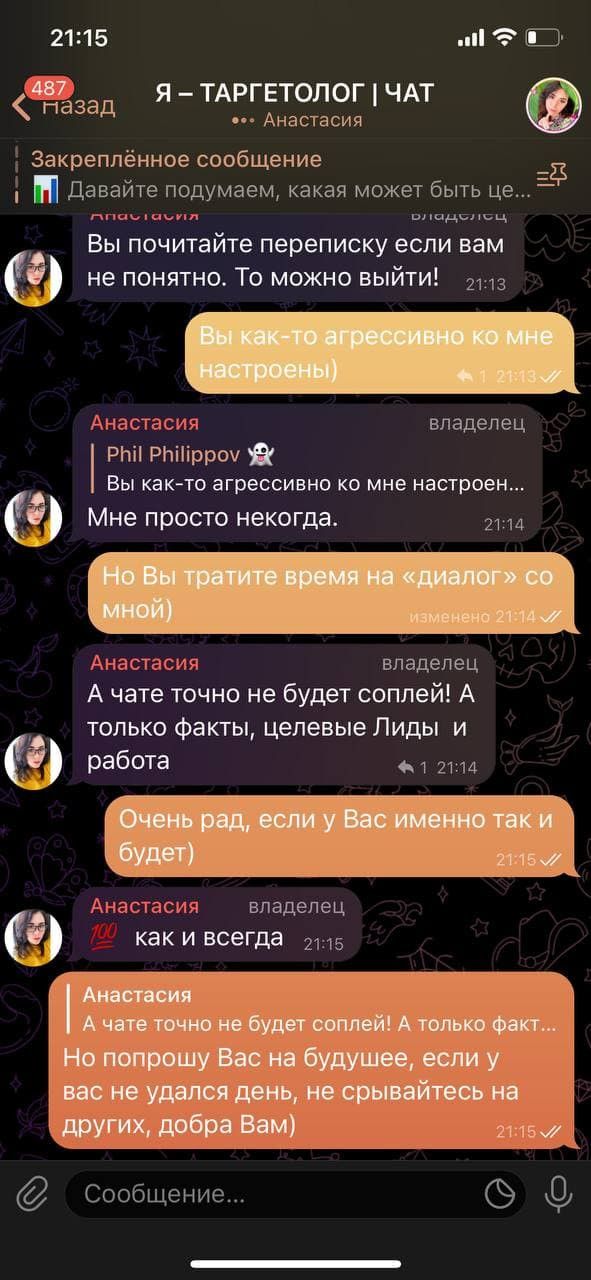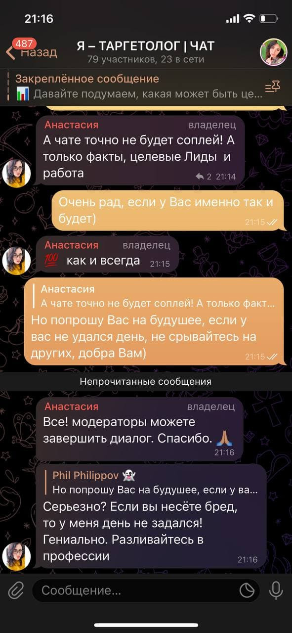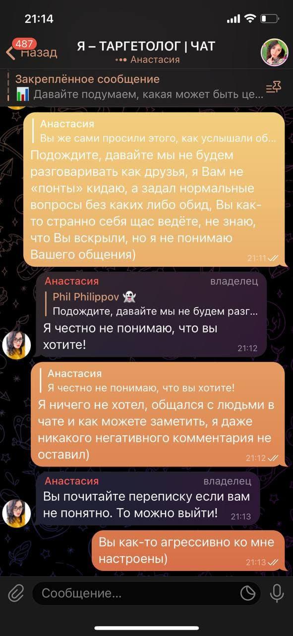 В общем канале было предложение создать чат для таргетологов, куда будут добавлены клиенты, которые ищут специалистов в этой сфере для дальнейшего запуска рекламы. Обсуждалась цена входа в этот чат. Градация была 5тыс. 8тыс. и 12тыс.(цифры близки к реальным). Естественно комментарии открыты, значит можно поделиться своим мнением, чем я и воспользовался. Озвучил, что если чат будет формата «базара» то ему красная цена будет 5 тыс. р., т.к. конкуренция, нужно сидеть и бороться за клиента и т.д. А дальше рассказ будет в скринах, сделанных из этого чата. Все они будут подписаны в хронологическом порядке.