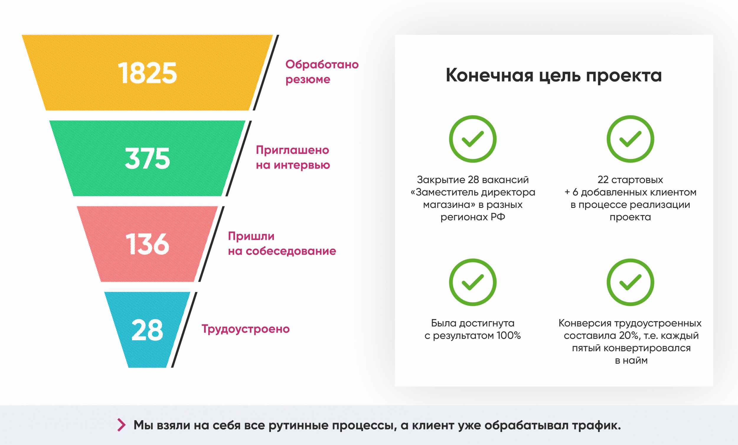 Конечная цель проекта — закрытие 28 вакансий «Заместитель управляющего магазином» в разных регионах РФ — 22 стартовых + 6 добавленных клиентом в процессе реализации проекта — была достигнута с результатом 100%.