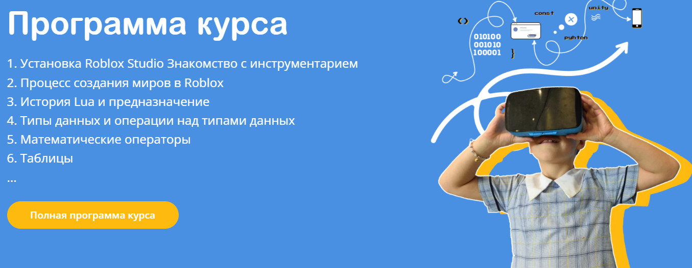 Roblox Studio — это бесплатная платформа для создания игр. Игры кодируются в системе объектно-ориентированного программирования, использующей язык программирования Lua для управления игровой средой. На занятиях по Roblox-программированию дети вникают в основы кодинга и учатся создавать игры.