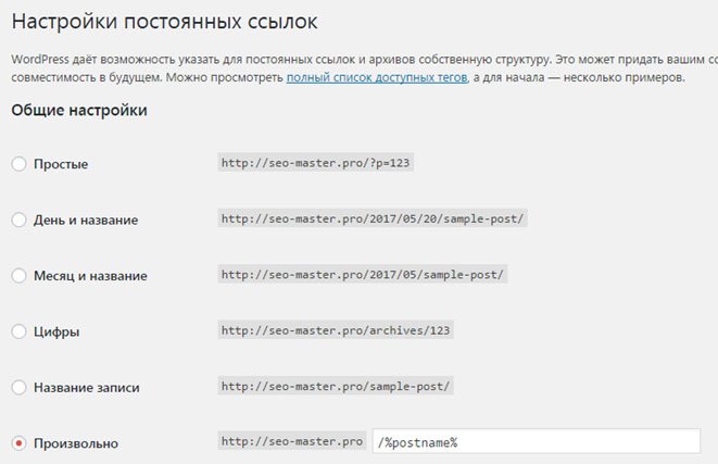 После это можно будет переходить к базовым настройкам в WordPress, в части «Настройки постоянных ссылок». Рекомендуется выбрать любой вариант, кроме первого — «Простые», который указан по умолчанию.