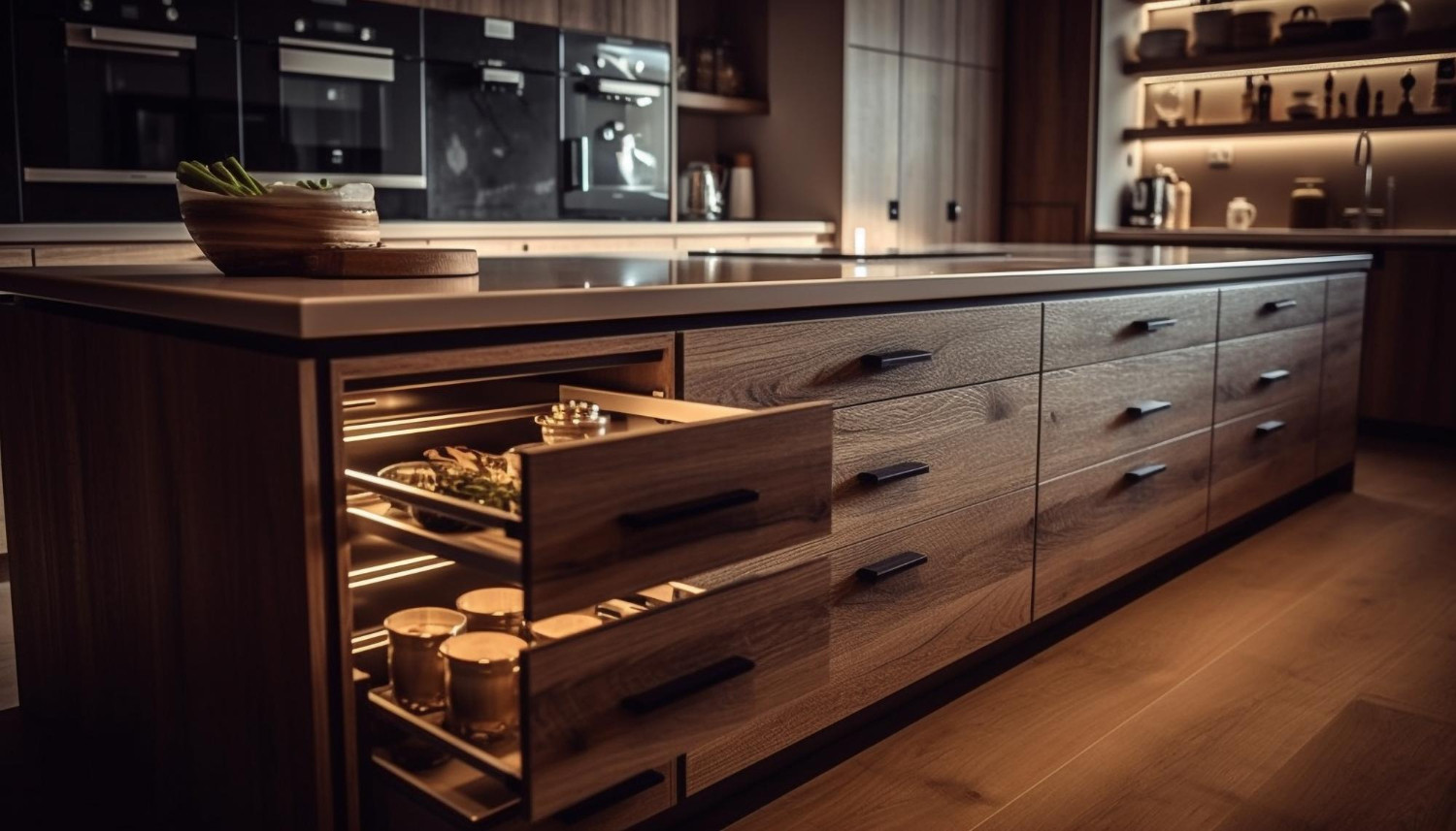 На кухне фасады и выдвижные секции открывают чаще, чем в других помещениях, поэтому доводчик нужен не только для комфорта. Из-за постоянных ударов изнашиваются петли, расшатываются крепежи. Плавное закрывание поддерживает безупречный вид фасадов.