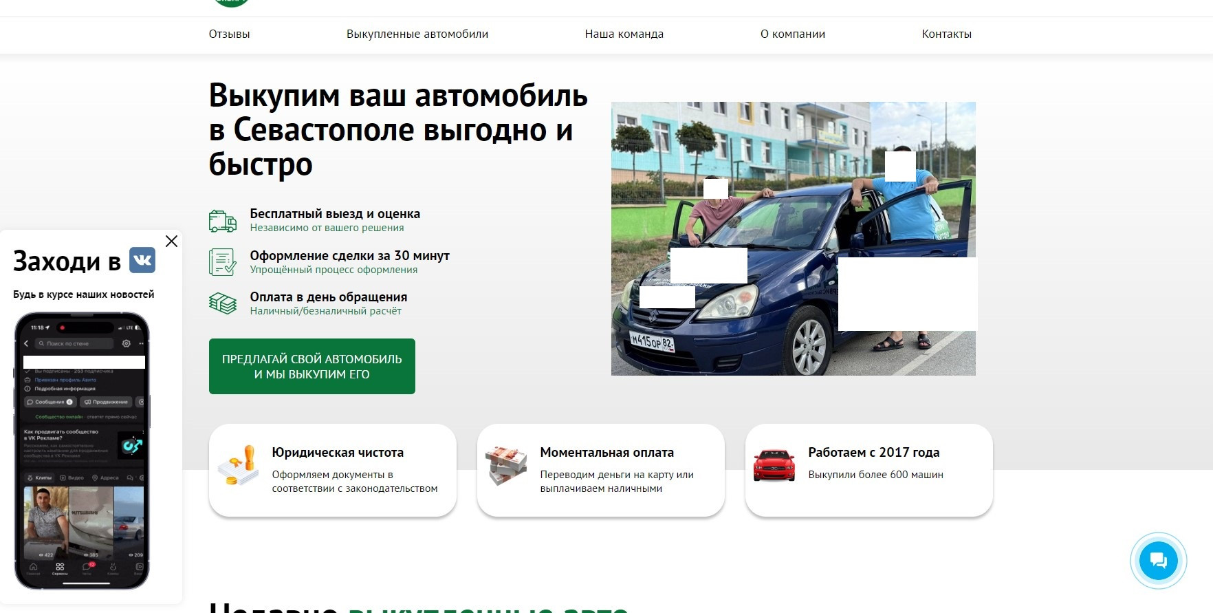 И при переходе на сайт на первом экране он видит " Выкупим ваш автомобиль в Севастополе выгодно и быстро".