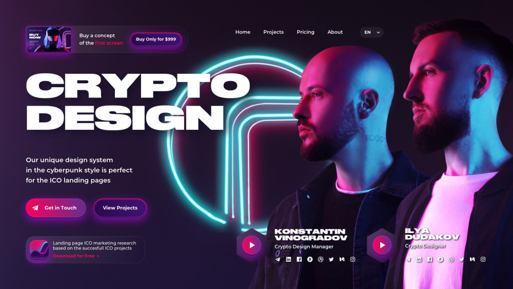 - Дизайн сделан по последним трендам дизайна криптовалютных проектов и всем своим видом выражает экспрессивное начало технологичного мира. При создании первичной концепции в первую очередь мы сфокусировались на футуристичных аспектах технологии blockchain. Одним словом — киберпанк ;-)