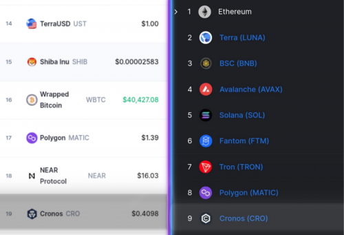 Теперь давайте поговорим про сеть Cronos. Сейчас она находится на 9-ом месте по сумме заблокированых средств (TVL) среди блокчейн платформ, а главная монета сети, и экосистемы Cryptocom с тикером CRO находится на 19 месте по капитализации в рейтинге всех криптовалют мира. Капитализация CRO на данный момент составляет чуть больше $10 млрд. В сети Cronos запущено более 120 проектов, и зарегистрировано более 500,000 адресов пользователей. Ниже на картинке вы можете видеть слева рейтинг криптовалют от Coinmarketcap, и справа рейтинг блокчейн-платформ от Defi Llama.