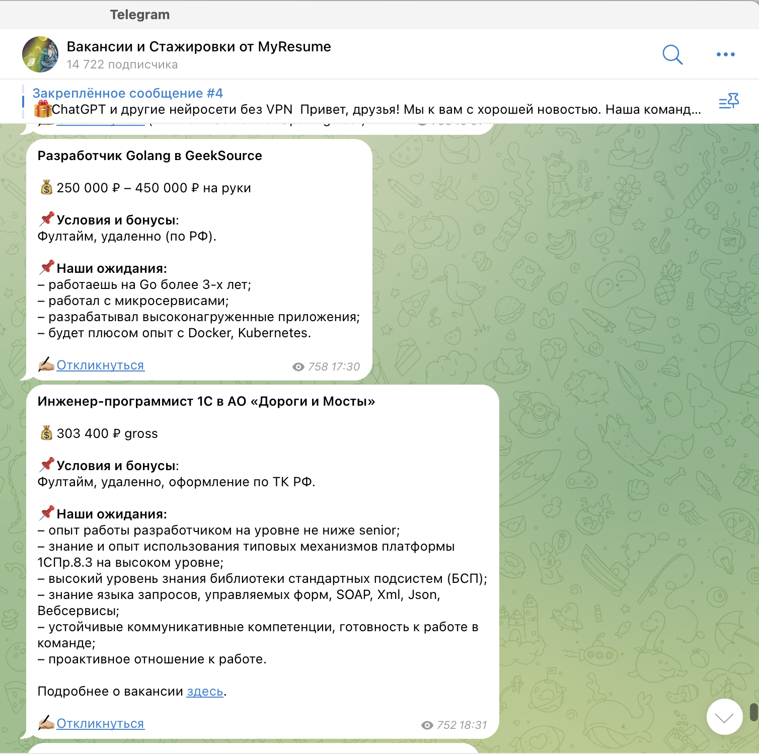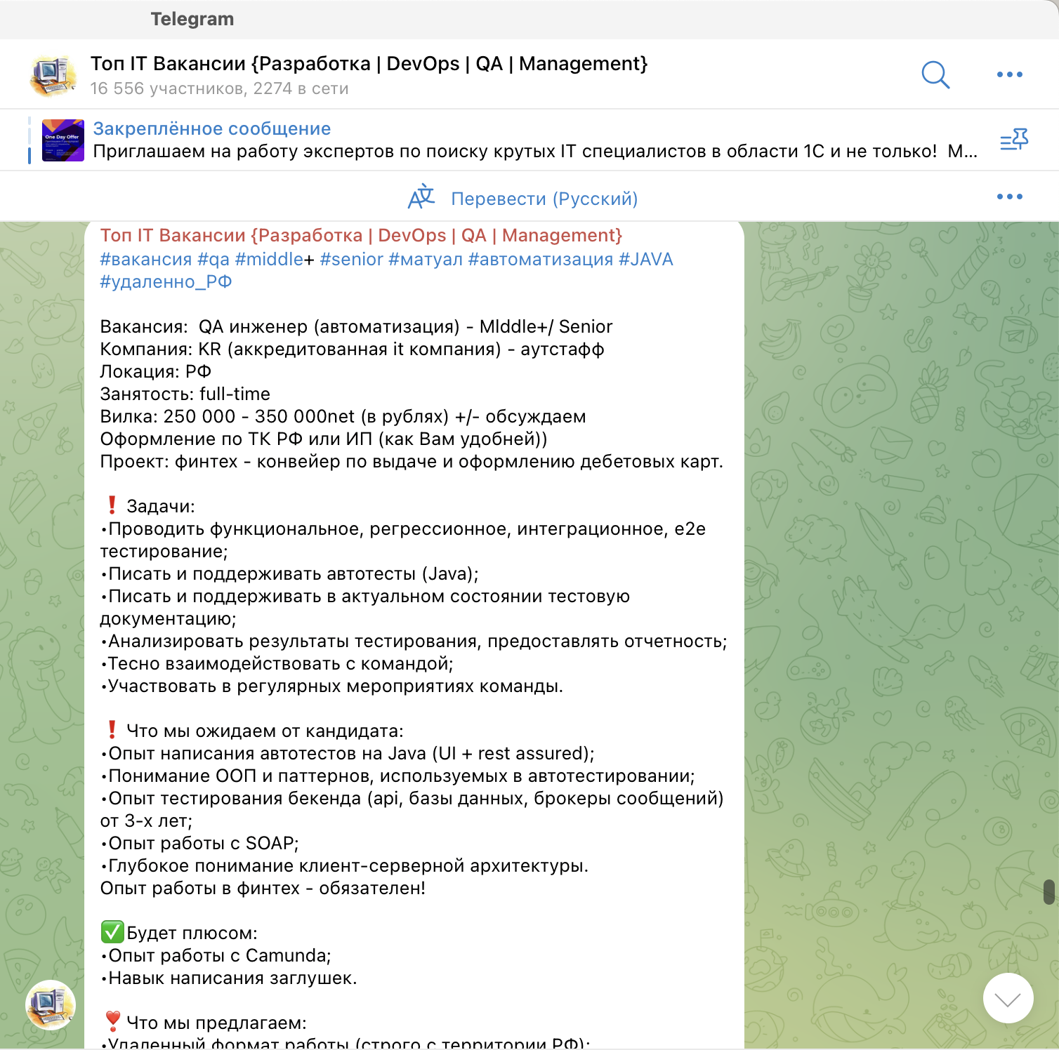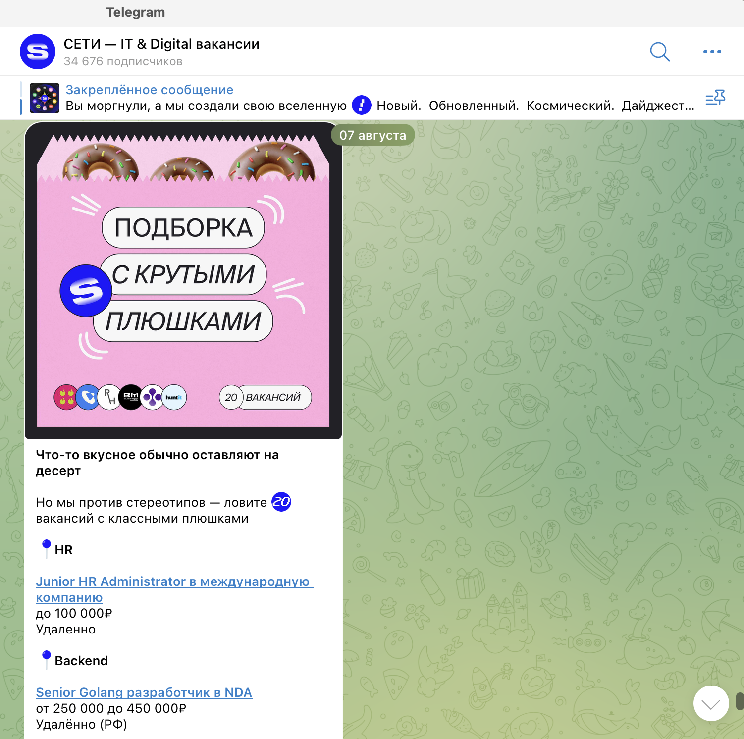 Приоритетные направления в этом канале — разработка, DevOps, QA, IT-менеджмент и дизайн. Размещение платное — 500 рублей за одну публикацию. Посты выходят не каждый день, поэтому можно не беспокоиться, что вакансия затеряется в ленте: