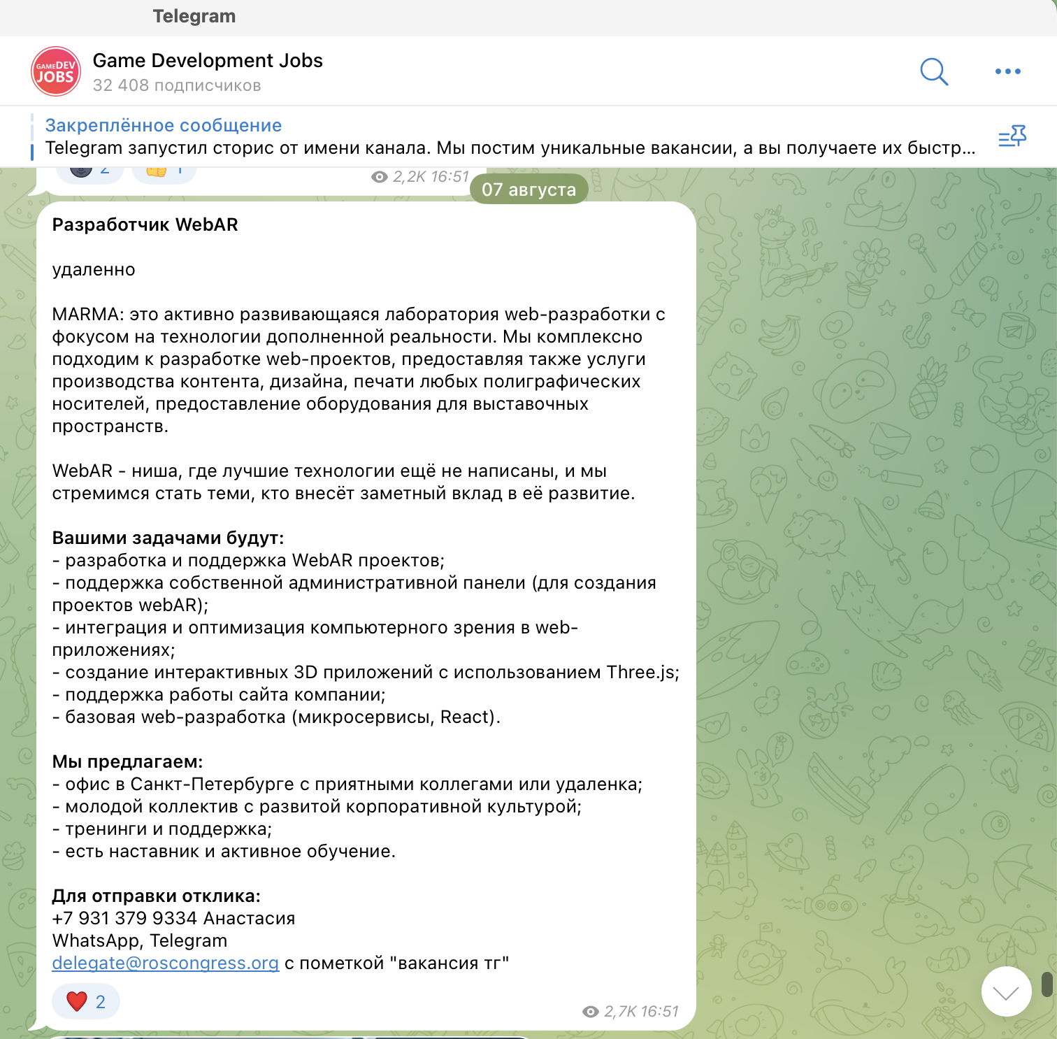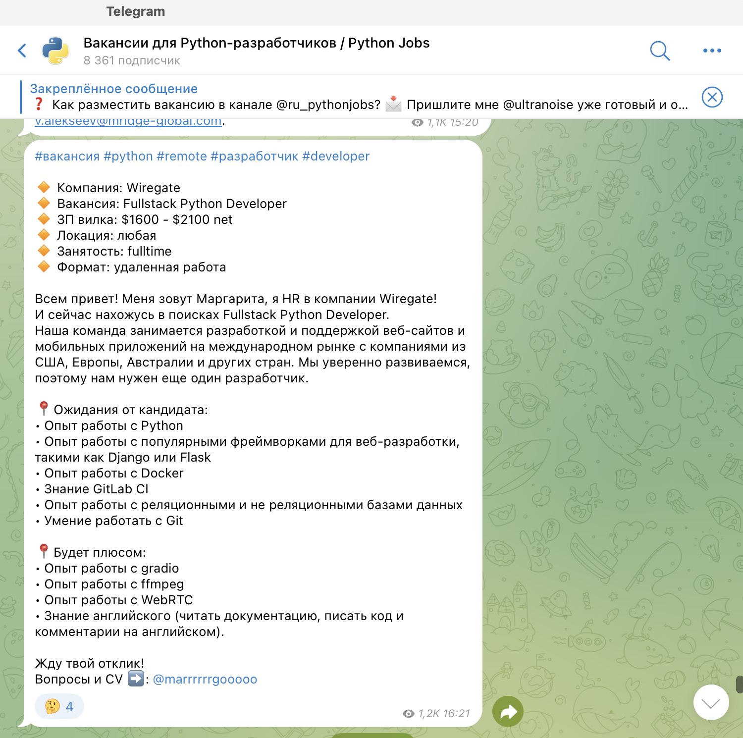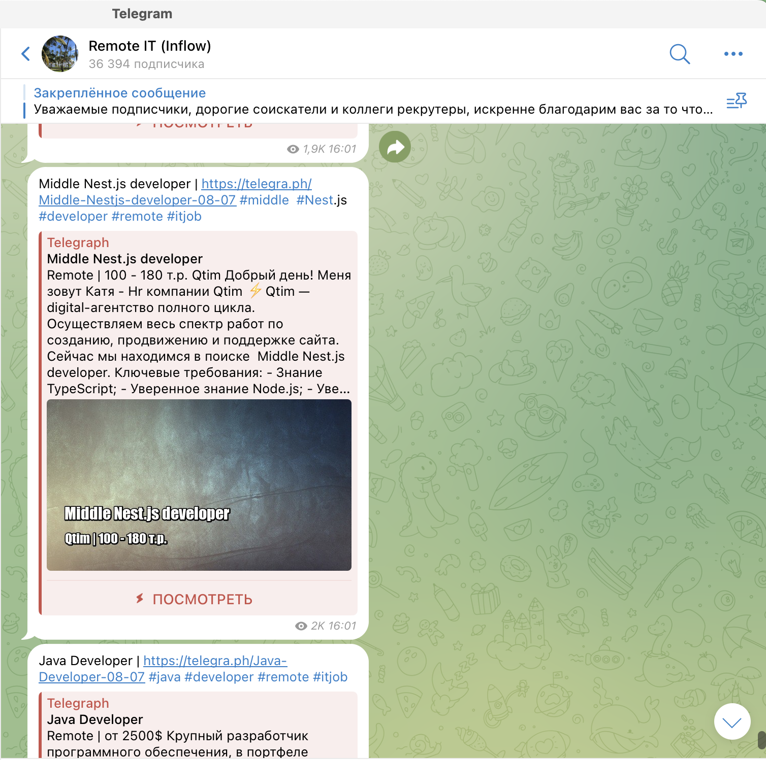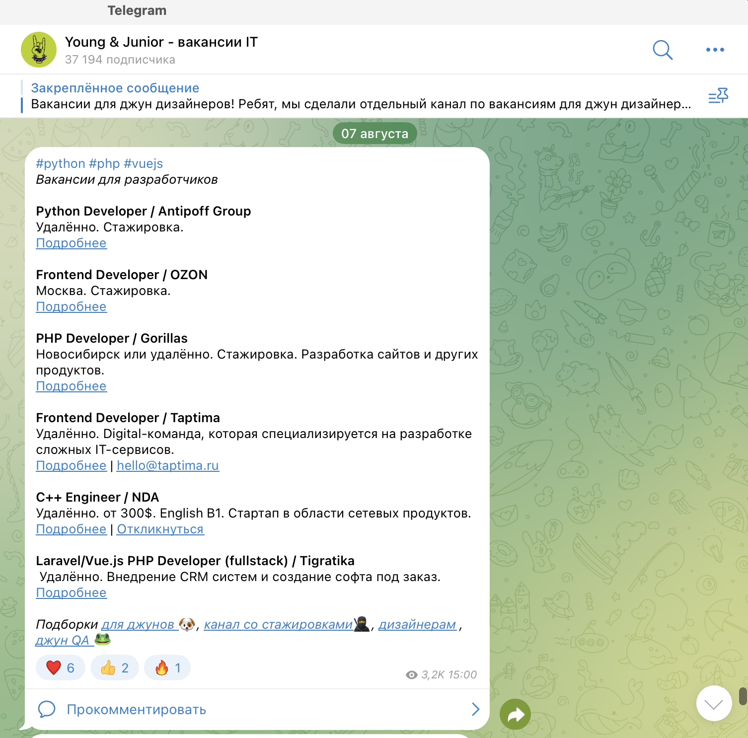 Приоритетные направления в этом канале — разработка, DevOps, QA, IT-менеджмент и дизайн. Размещение платное — 500 рублей за одну публикацию. Посты выходят не каждый день, поэтому можно не беспокоиться, что вакансия затеряется в ленте: