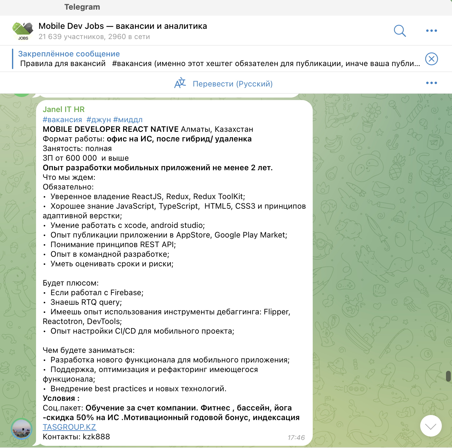 Один из немногих каналов в Телеграме с бесплатным размещением вакансий. Подать заявку на поиск IT-специалиста можно через админа. Условия публикации объявлений вынесены в отдельный пост. Если кратко, то главное — чтобы зарплата потенциального сотрудника была не меньше 80 000 рублей на руки. Предложения для новичков и на частичную занятость принимают любые:
