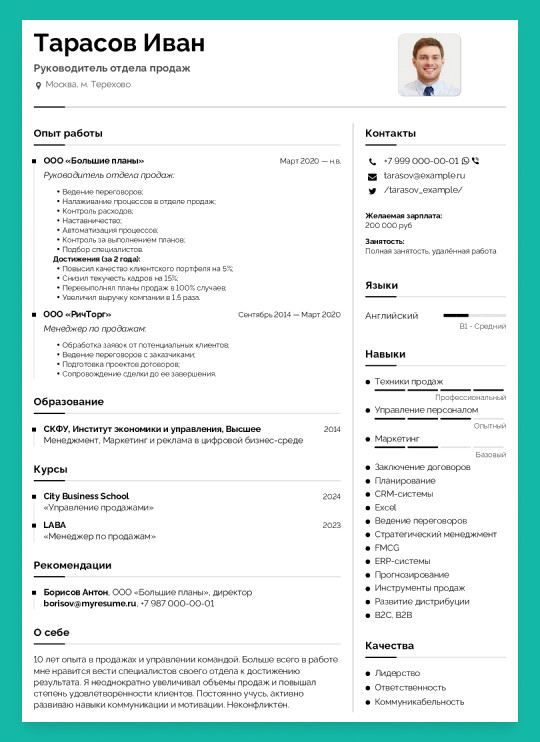 Цвет. Излишний креатив в оформлении резюме менеджера неуместен — он будет отвлекать от содержания. Классический вариант для управленцев — сочетание черного и белого. Если вам хочется сделать отклик на вакансию более оригинальным, используйте бланки в спокойных тонах. Где найти готовые шаблоны резюме: Переходим к содержанию документа. Сначала рассмотрим основные блоки, а затем остановимся на дополнительной информации, которая поможет вам отстроиться от конкурентов. В «шапке» резюме нужно написать фамилию, имя и отчество, ниже — желаемую позицию. В отдельном блоке следует оставить контакты для связи: номер телефона, адрес email, ссылки на профессиональные аккаунты в соцсетях и никнеймы в мессенджерах. Полный адрес указывать не стоит — достаточно обозначить город и район, в котором вы живете. При устройстве на офисную позицию можно добавить название ближайшей к вам станции метро или автобусной остановки. Это самый важный раздел резюме. Здесь нужно перечислить все места занятости за последние 5–10 лет в обратном хронологическом порядке. Формат записи: название компании → должность → период работы → ключевые обязанности → достижения за последние 2 года. При указании профессиональных успехов используйте цифры и факты — потенциальный работодатель должен понимать, какую пользу вы принесли на прежнем месте работы. Наличие диплома вуза или ссуза станет преимуществом при трудоустройстве даже в том случае, если он не связан с менеджментом и сферой деятельности компании. Напишите, какое образовательное учреждение вы окончили, когда и по какому направлению: В отдельной графе перечислите пройденные профильные курсы. Они могут быть связаны с управлением, спецификой работы компании, в также развитием необходимых для менеджера софт скиллов, например, коммуникативных компетенций или лидерских навыков. Руководитель должен обладать внушительным спектром компетенций: управленческих, технических и личностных. В резюме сосредоточьтесь на тех навыках, которые указаны в тексте вакансии. Для ключевых скиллов обозначьте уровень владения. В этом разделе, несмотря на его название, писать о личном не стоит. Здесь можно рассказать о карьерных планах, ценностях и мотивации к трудоустройству в компании, а также раскрыть, как то или иное личное качество помогает вам в работе. Например: «Дипломированный сейлз-менеджер. 10 лет занимаю руководящие должности. В 2023 году получил степень MBA. Моя цель — развивать стратегические подходы к увеличению продаж и формированию сильной команды. Умею выстраивать долгосрочные партнерские связи и разрабатывать эффективные стратегии, способствующие росту бизнеса». Публикации. Упоминания в СМИ говорят о том, что вы занимаетесь продвижением личного бренда. Перечислите издания, в которых публиковали статьи и интервью. По возможности оставьте ссылки. Рекомендации. Оставьте контакты людей, готовых дать вам положительную характеристику, — представителей топ-менеджмента с прежнего места работы или экспертов отрасли. Не забудьте согласовать с ними этот момент. Хобби. Человек, у которого есть увлечения, умеет соблюдать work-life баланс, а значит, он меньше подвержен профессиональному выгоранию. В резюме можно рассказать об изучении иностранных языков, психологии, чтении бизнес-литературы, волонтерстве, спорте, путеше