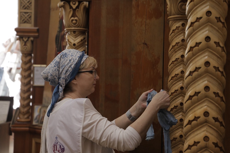 В начале трудового дня волонтёрам был определен фронт работ: после замены окон в соборе необходимо было очистить храм от строительной пыли.