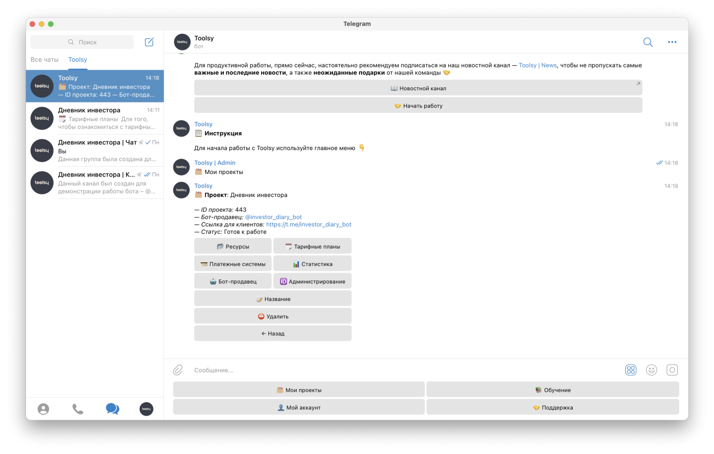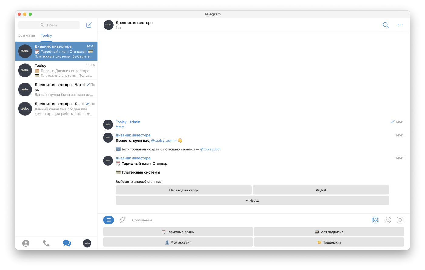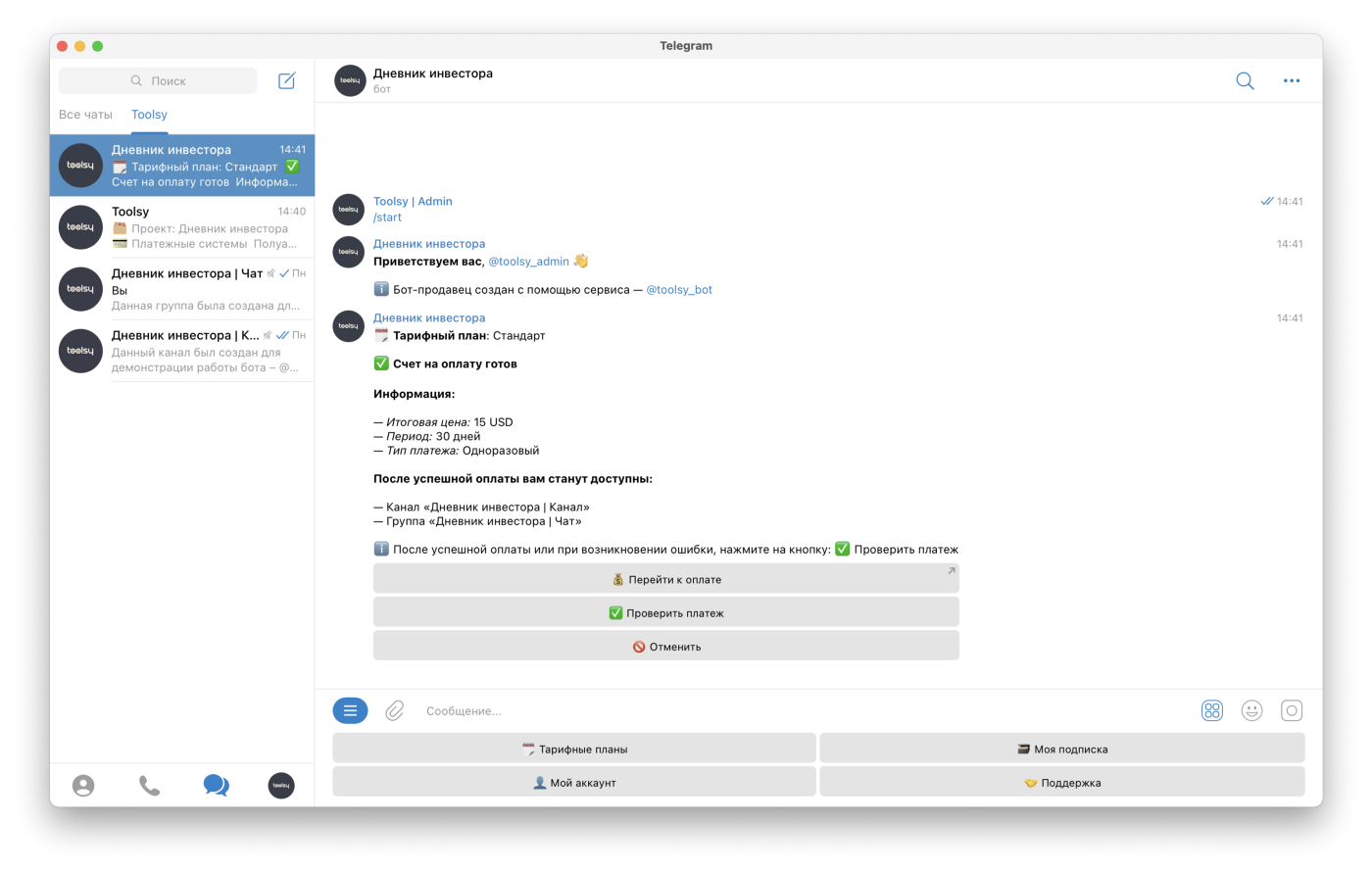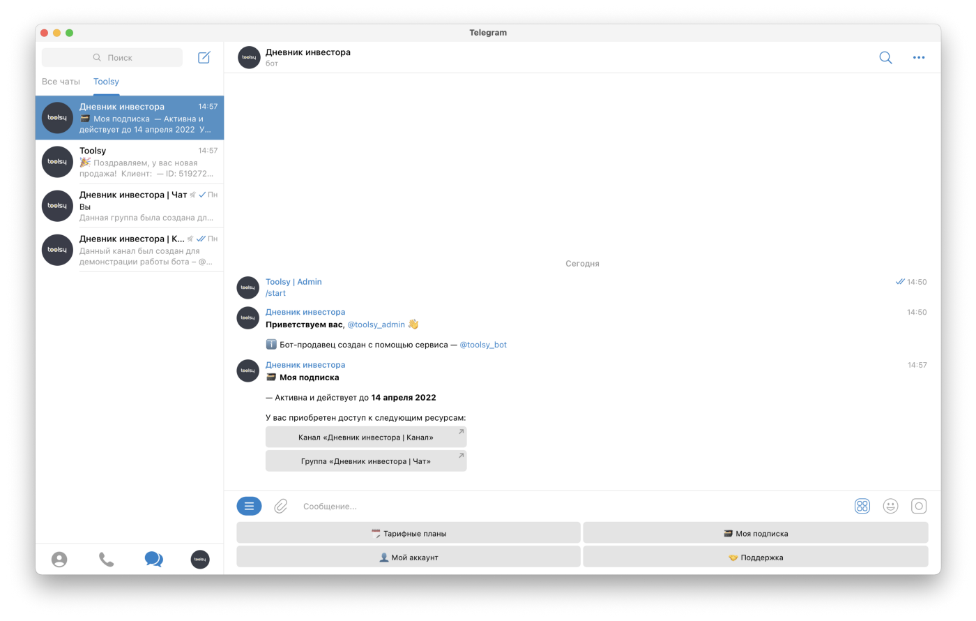 Все, что потребуется от владельца Telegram канала/группы — предоставить своим клиентам ссылку на бота-продавца, а всю остальную работу берет на себя Toolsy.