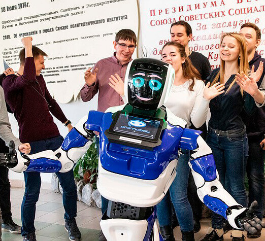Промобот на 80% состоит из отечественных комплектующих, знает несколько языков и с легкостью запоминает большой объем информации.