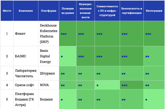 Deckhouse Kubernetes Platform получила наиболее высокие оценки по всем критериям рейтинга: функциональным возможностям, интеграциям, безопасности и сертификации, совместимости с ПО и инфраструктурой, а также позициям на рынке.