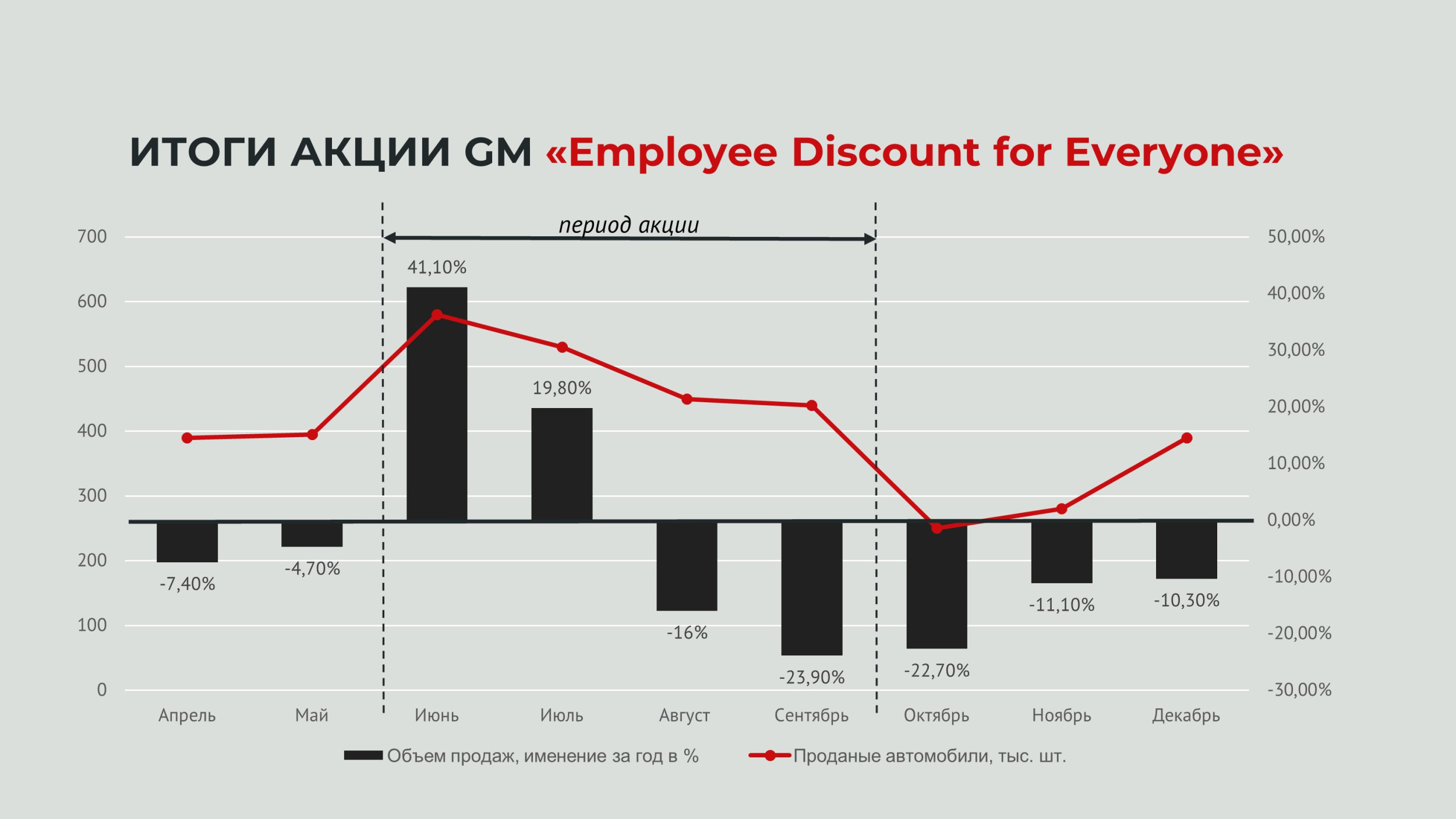 Первый важный вопрос после двух месяцев удивительно высоких продаж: откуда взялись эти покупатели? Почти все эти клиенты были из будущего. Клиенты, которые планировали покупку осенью и зимой купили товар по акции. А по итогам акции продавать автомобили было уже не кому.