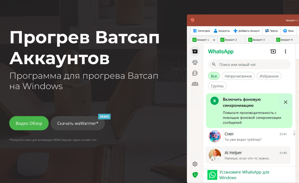 Прогрев вручную требует много времени, особенно для крупных бизнесов. Здесь на помощь приходят специализированные инструменты. Один из лучших — waWarmer. Этот софт для Windows симулирует естественную активность: автоматическая отправка сообщений, поддержка прокси для безопасности, имитация переписок и постепенное наращивание объемов.