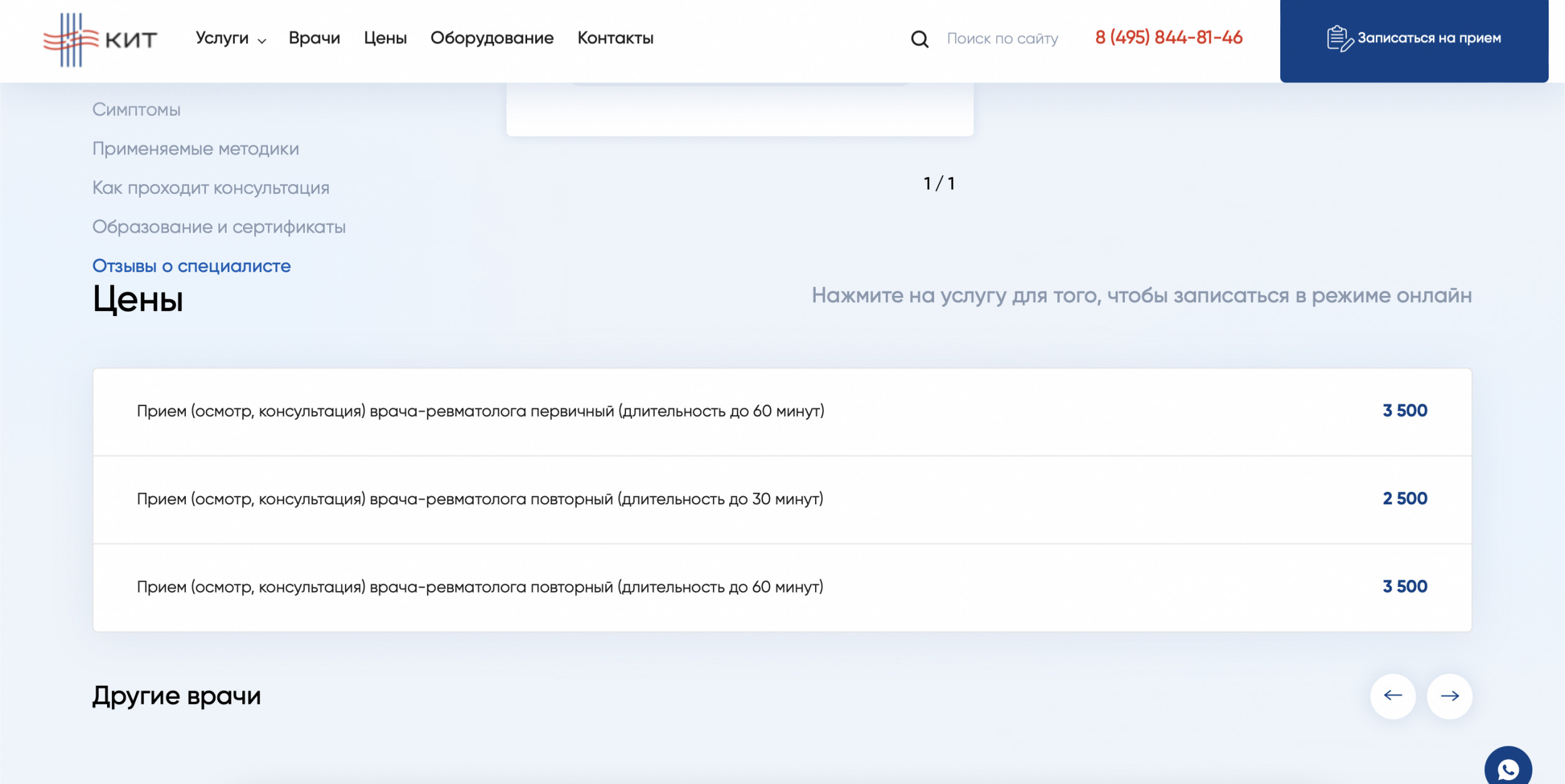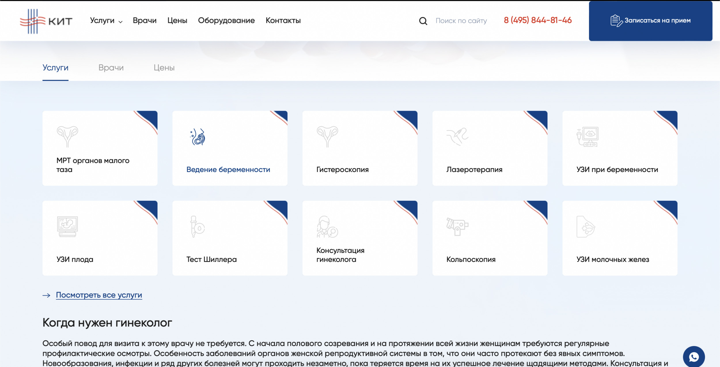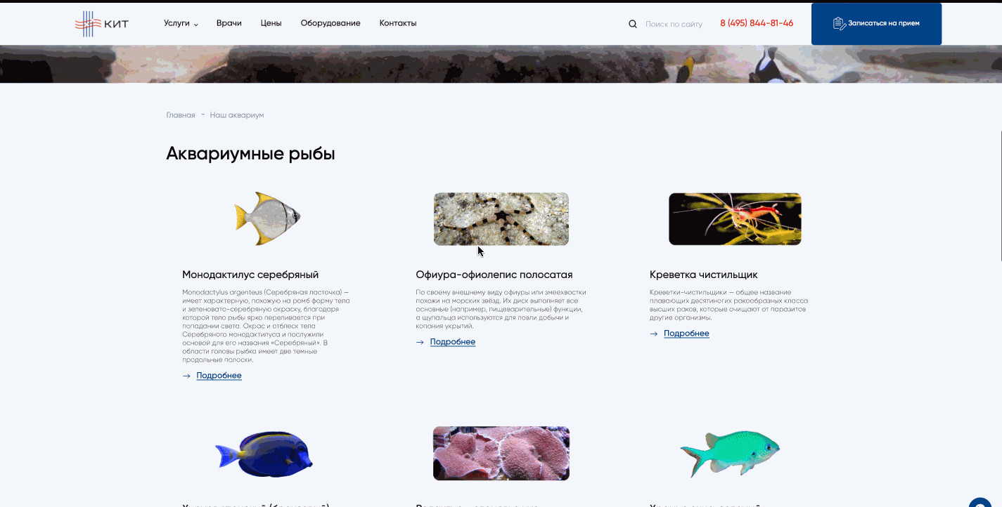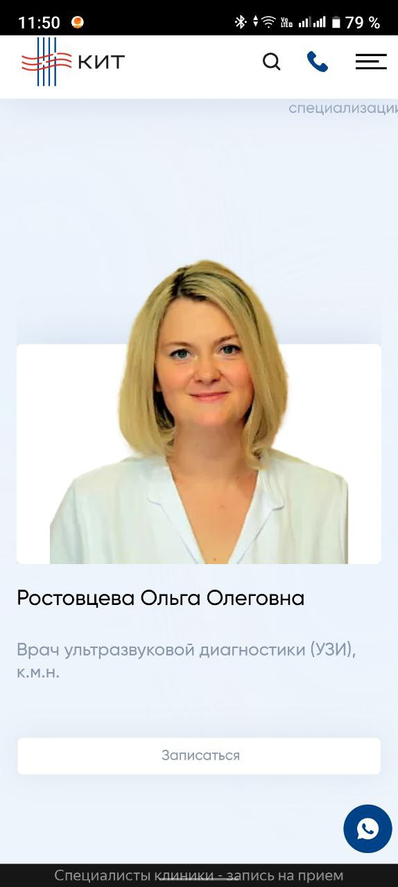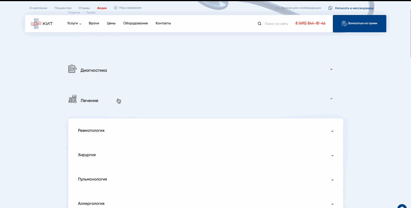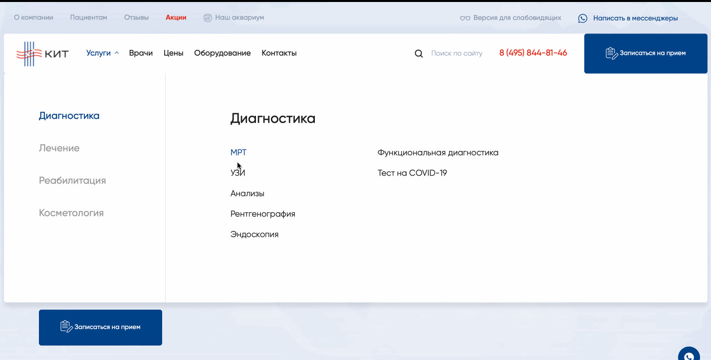 В зависимости от ситуации человек может оказаться в любой части сайта: от карточки конкретного товара до главной страницы. Предлагаем рассмотреть ситуацию, когда пользователь попадает на главную страницу. Первый экран состоит из четырех важных элементов: Читатели-специалисты, думаете, все слишком предсказуемо? Но ведь работает! Клиент — типичный представитель медицинской ниши. Нет смысла менять устоявшуюся структуру, к которой привыкли пользователи, повидавшие десятки сайтов иных клиник. Гораздо важнее другое: как быстро «типичный пользователь» доберется до нужного раздела с услугами. Человек кликает по кнопке в шапке сайта и попадает в развернутый каталог. Тут есть четыре категории — диагностика, лечение, реабилитация, косметология. Вместо классического списка услуг человек видит удобную структуру, адаптированную точно под его потребности. Если мы вывалим весь список услуг сразу, пройдет немало времени, прежде чем пользователь найдет нужную услугу из длинного списка. Есть вероятность, что он и вовсе закроет сайт и уйдет к конкурентам. Но ведь гораздо лучше, когда все услуги собраны по удобным разделам! Похожий порядок позиционирования услуг мы применили на втором экране главной страницы сайта. Когда человек находит нужную услугу из списка, он попадает на соответствующую страницу-карточку услуги. Она включает несколько блоков, каждый из которых призван «прогреть» посетителя к оформлению сделки: Все блоки расположены в строгом порядке и не мешают друг другу. Особенно важно было соблюсти логику вложенности, где конкретные услуги входят в общие услуги, а общие услуги — в разделы. Большая часть пользователей выбирают не услугу, а врача. Это смежные, но одновременно принципиально разные потребности. Поэтому после презентации доступных услуг и подготовки десятков карточек мы приступили к оформлению раздела с медицинскими специалистами. В разделе «Врачи» доступна опция поиска докторов по специальностям. Если человек выберет нужный параметр, то попадет на страницу с перечнем доступных врачей. Под каждого специалиста мы подготовили отдельную страницу, куда поместили основную информацию о специалисте и добавили отзывы. Отзывы помогают посетителю быстрее сориентироваться в выборе. Время до оформления заявки заметно сокращается. В конце страницы с врачом расположен прайс-лист на услуги специалиста. Если же человек изначально заходит на сайт в поисках общего прайс-листа, то может выбрать раздел «Цены». Здесь, по уже привычному принципу вложенности, расположен подробный список оказываемых услуг вместе с ценниками. Поскольку клиника КИТ позиционирует себя как инновационный центр, важно поместить отдельный раздел с описанием доступного оборудования. Посетитель может изучить доступную для работы технику, найти ее характеристики и увидеть те услуги, для которых применяется тот или иной вид оборудования. Мы сделали два раздела для пользователей, которые любят читать. Одним — большой блог со статьями и обновляемыми новостями, другим — раздел со всеми отзывами о клинике, ее услугах и врачах. Блог нужен не только для заинтересованной части пользователей, но и как инструмент для поискового продвижения. С его помощью можно привлекать органический трафик из поисковых систем. Раздел с отзывами — это отличная возможность 