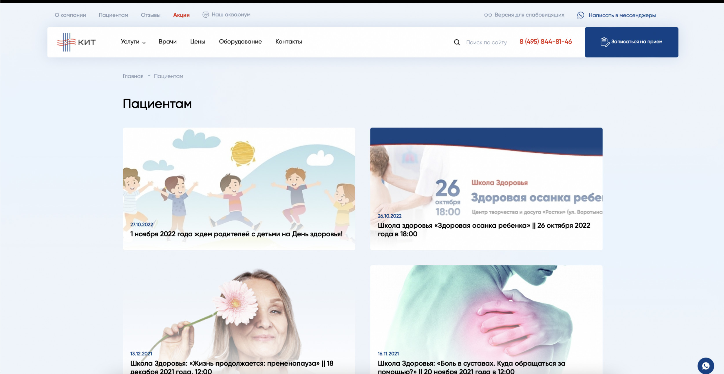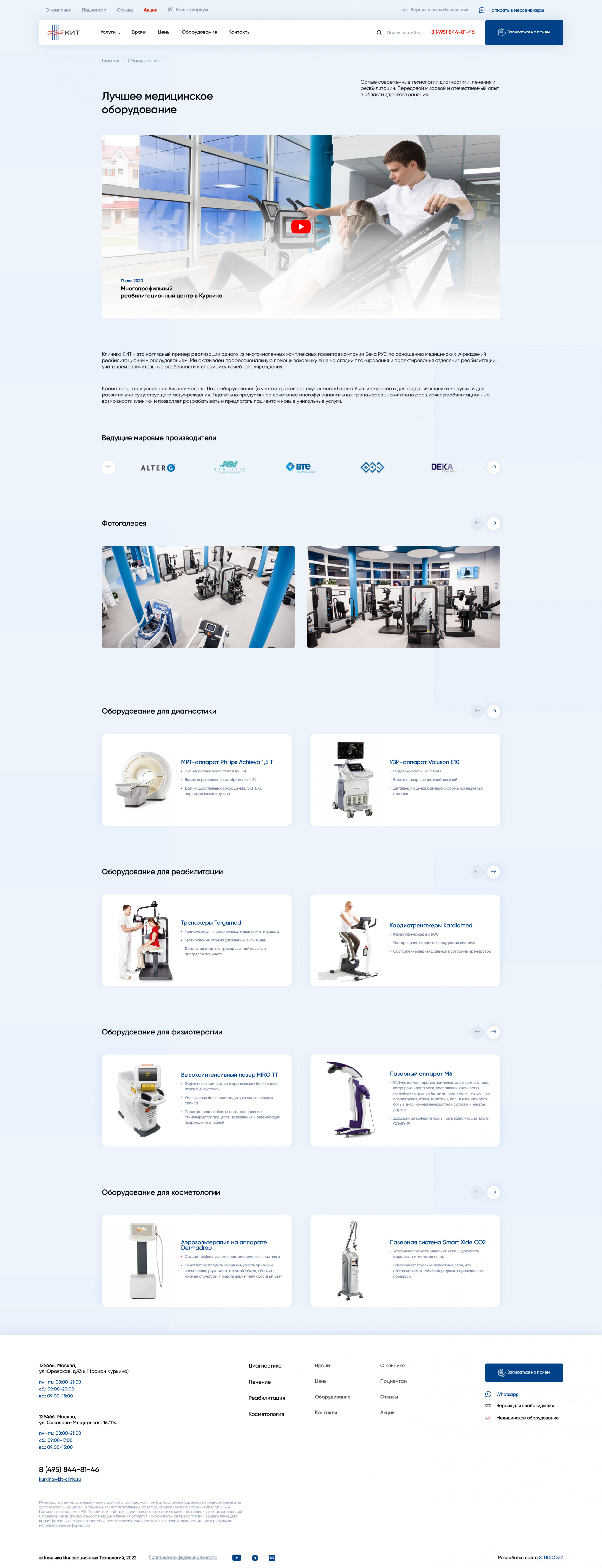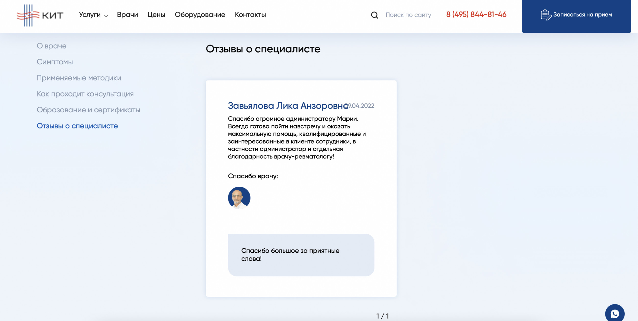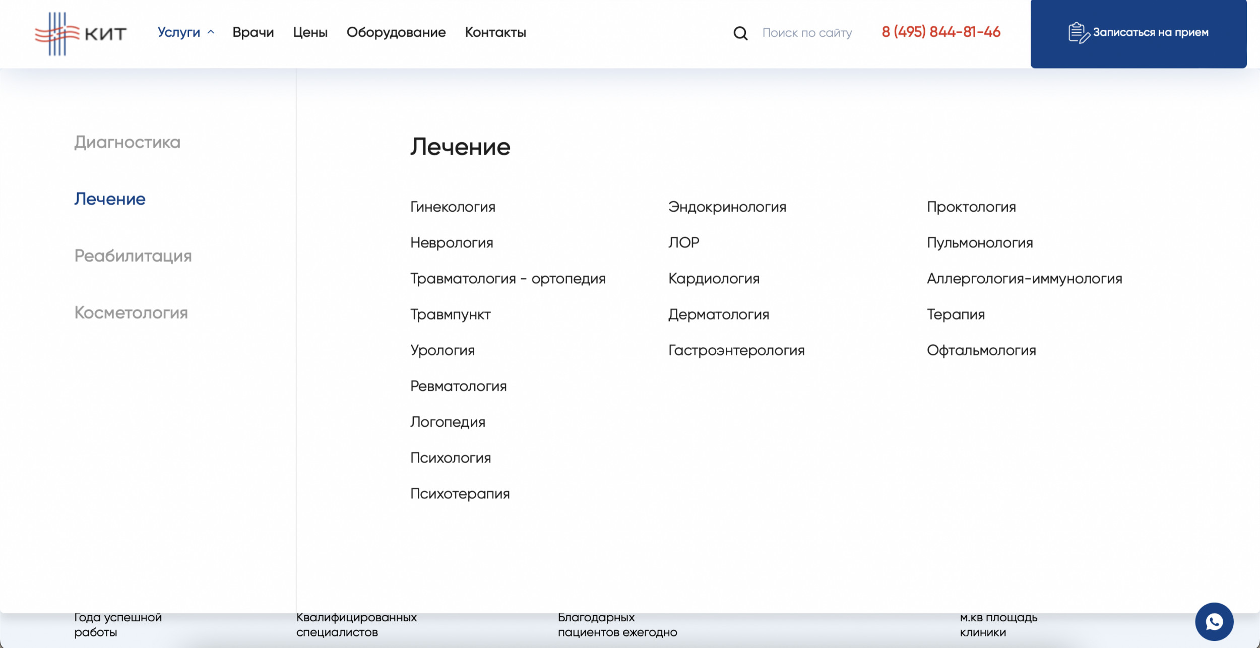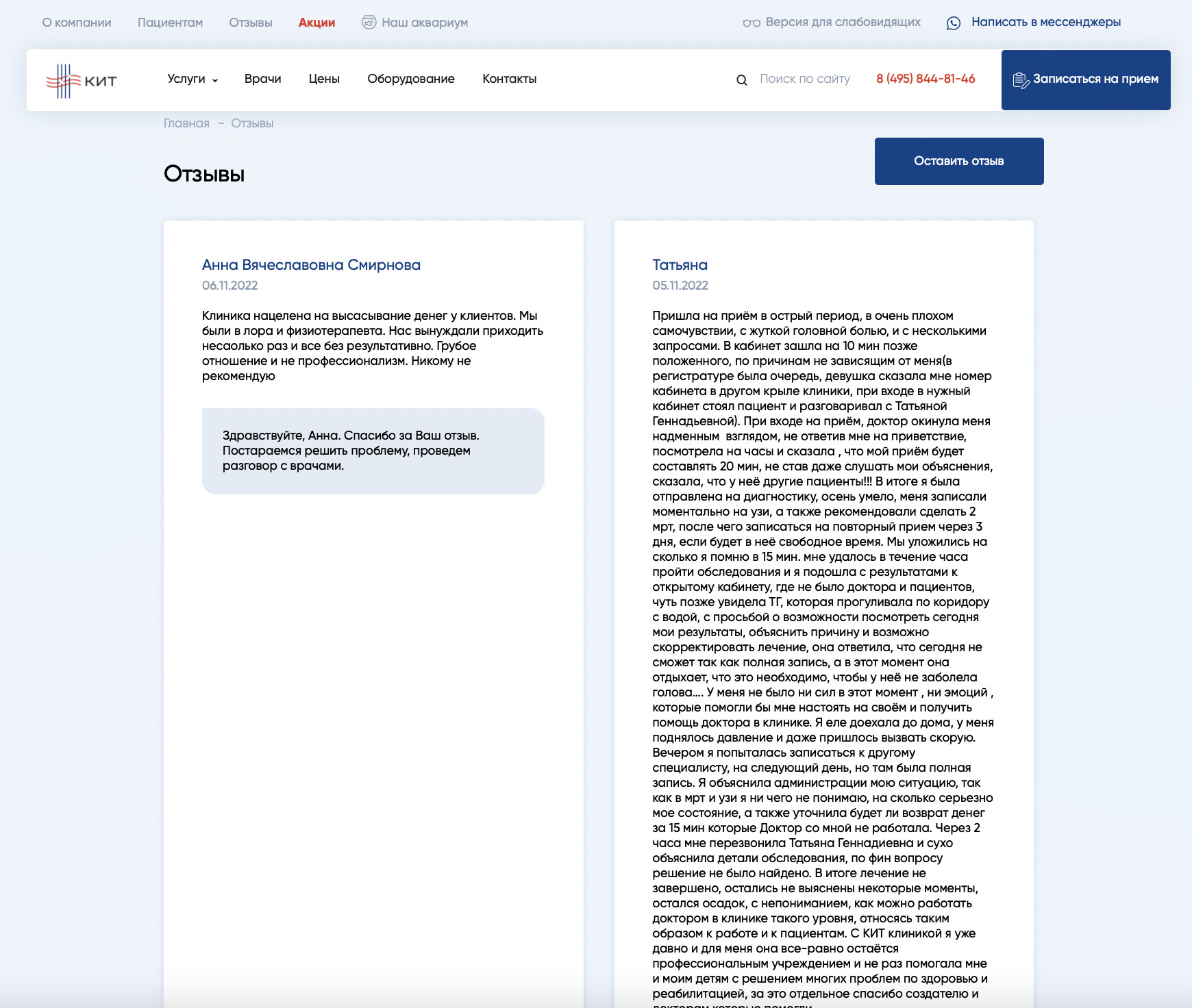 В зависимости от ситуации человек может оказаться в любой части сайта: от карточки конкретного товара до главной страницы. Предлагаем рассмотреть ситуацию, когда пользователь попадает на главную страницу. Первый экран состоит из четырех важных элементов: Читатели-специалисты, думаете, все слишком предсказуемо? Но ведь работает! Клиент — типичный представитель медицинской ниши. Нет смысла менять устоявшуюся структуру, к которой привыкли пользователи, повидавшие десятки сайтов иных клиник. Гораздо важнее другое: как быстро «типичный пользователь» доберется до нужного раздела с услугами. Человек кликает по кнопке в шапке сайта и попадает в развернутый каталог. Тут есть четыре категории — диагностика, лечение, реабилитация, косметология. Вместо классического списка услуг человек видит удобную структуру, адаптированную точно под его потребности. Если мы вывалим весь список услуг сразу, пройдет немало времени, прежде чем пользователь найдет нужную услугу из длинного списка. Есть вероятность, что он и вовсе закроет сайт и уйдет к конкурентам. Но ведь гораздо лучше, когда все услуги собраны по удобным разделам! Похожий порядок позиционирования услуг мы применили на втором экране главной страницы сайта. Когда человек находит нужную услугу из списка, он попадает на соответствующую страницу-карточку услуги. Она включает несколько блоков, каждый из которых призван «прогреть» посетителя к оформлению сделки: Все блоки расположены в строгом порядке и не мешают друг другу. Особенно важно было соблюсти логику вложенности, где конкретные услуги входят в общие услуги, а общие услуги — в разделы. Большая часть пользователей выбирают не услугу, а врача. Это смежные, но одновременно принципиально разные потребности. Поэтому после презентации доступных услуг и подготовки десятков карточек мы приступили к оформлению раздела с медицинскими специалистами. В разделе «Врачи» доступна опция поиска докторов по специальностям. Если человек выберет нужный параметр, то попадет на страницу с перечнем доступных врачей. Под каждого специалиста мы подготовили отдельную страницу, куда поместили основную информацию о специалисте и добавили отзывы. Отзывы помогают посетителю быстрее сориентироваться в выборе. Время до оформления заявки заметно сокращается. В конце страницы с врачом расположен прайс-лист на услуги специалиста. Если же человек изначально заходит на сайт в поисках общего прайс-листа, то может выбрать раздел «Цены». Здесь, по уже привычному принципу вложенности, расположен подробный список оказываемых услуг вместе с ценниками. Поскольку клиника КИТ позиционирует себя как инновационный центр, важно поместить отдельный раздел с описанием доступного оборудования. Посетитель может изучить доступную для работы технику, найти ее характеристики и увидеть те услуги, для которых применяется тот или иной вид оборудования. Мы сделали два раздела для пользователей, которые любят читать. Одним — большой блог со статьями и обновляемыми новостями, другим — раздел со всеми отзывами о клинике, ее услугах и врачах. Блог нужен не только для заинтересованной части пользователей, но и как инструмент для поискового продвижения. С его помощью можно привлекать органический трафик из поисковых систем. Раздел с отзывами — это отличная возможность 